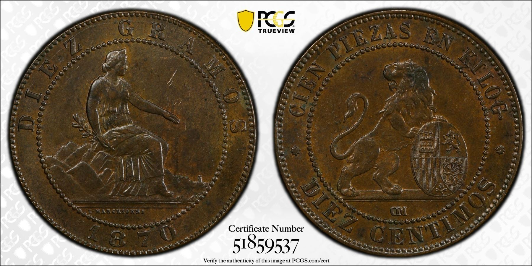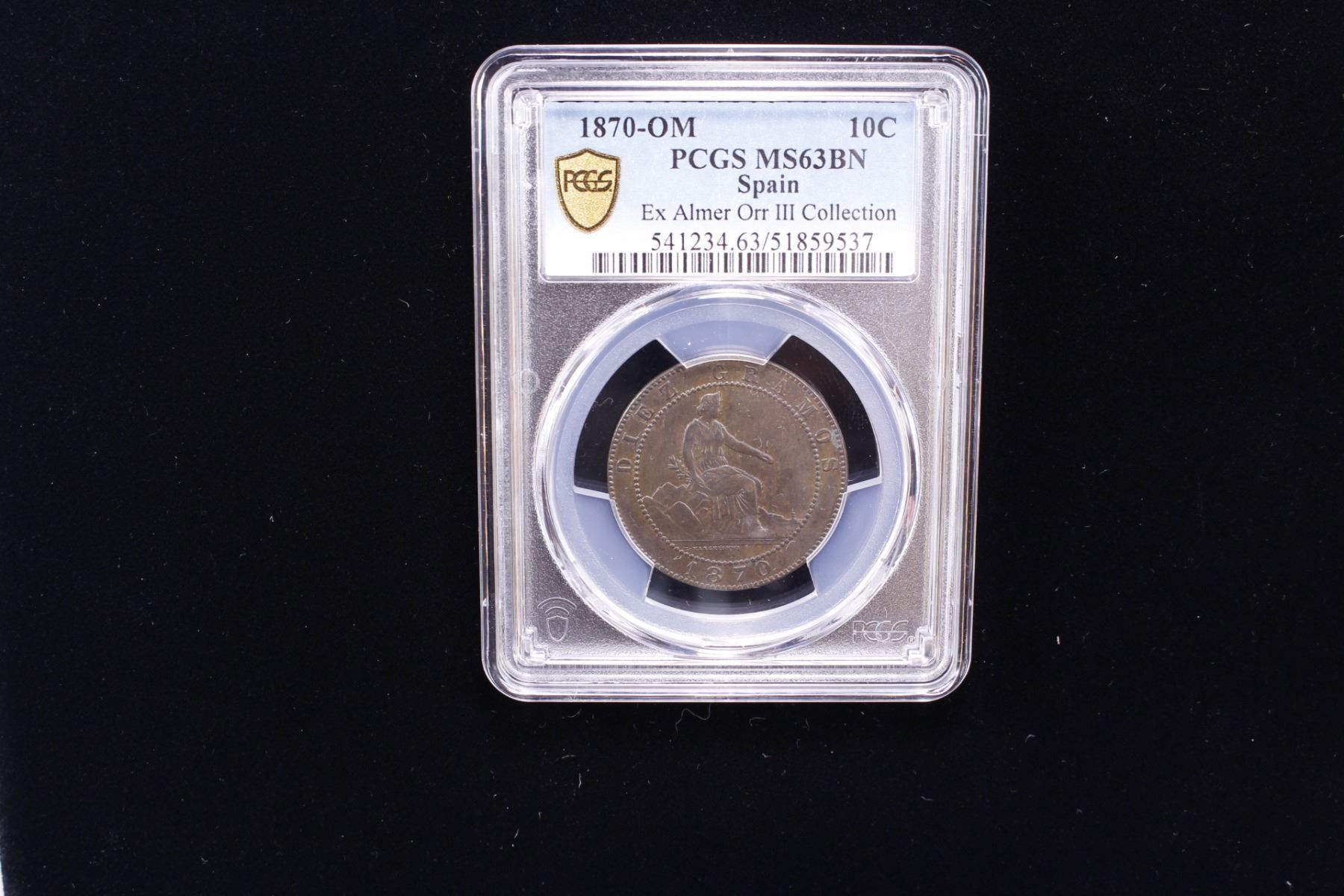 SPAIN: Provisional Government, AE 10 centimos, 1870, KM-663, a lovely example, PCGS graded MS63 BN, ex Almer H. Orr III Collection. The letters OM on reverse stand for Oeschger Mesdach & Co.