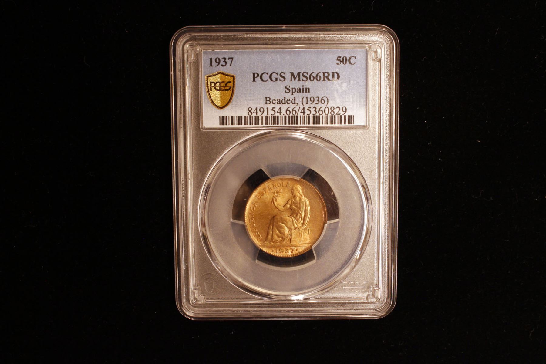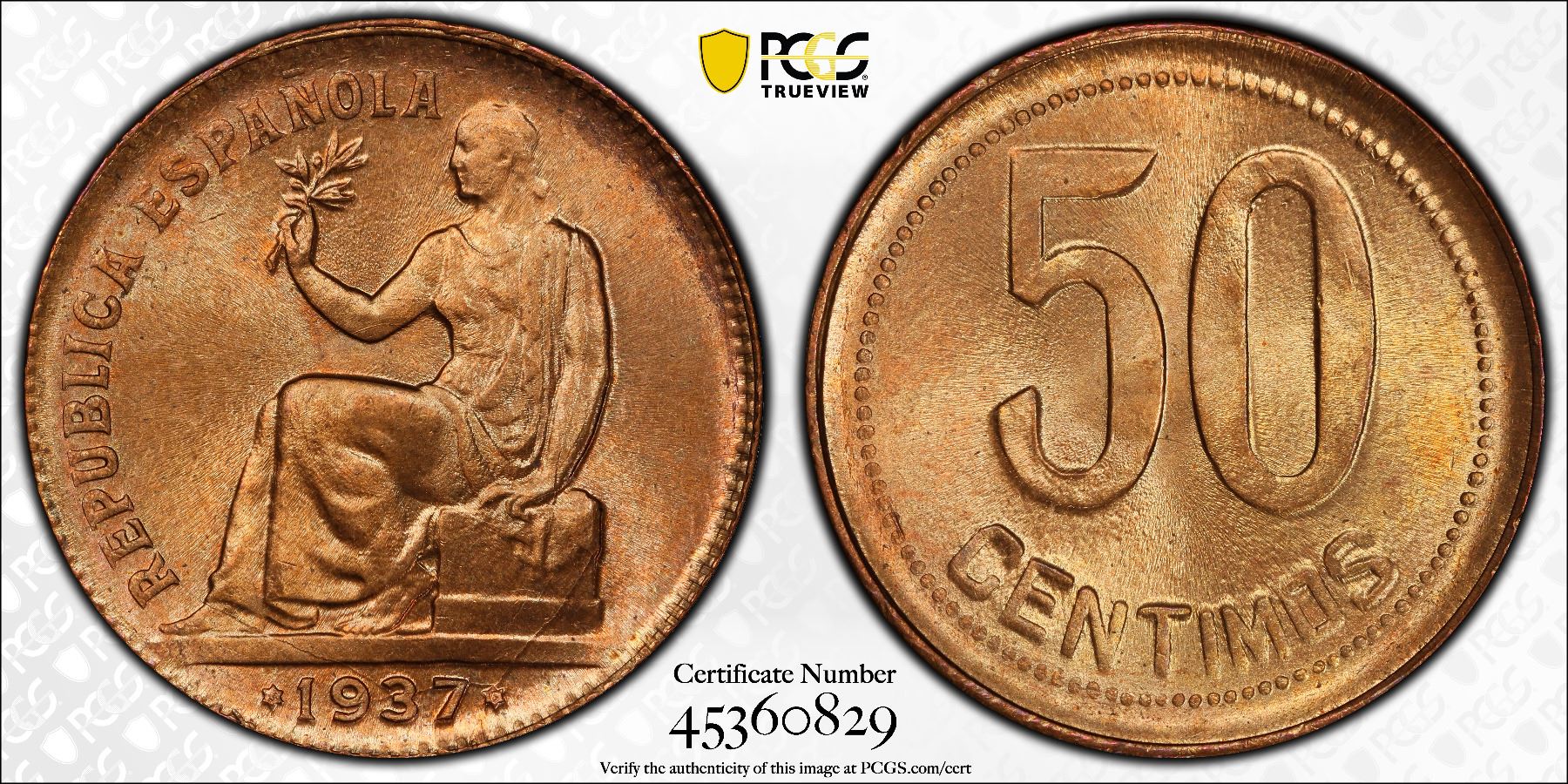 SPAIN: Second Republic, AE 50 centimos, 1937 (36), KM-754.1, 36 in star and beads around value, Madrid mint, a fantastic example, PCGS graded MS66 RD.