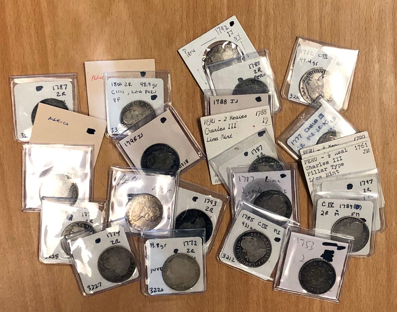 SPANISH COLONIES:LOT of 26 pillar and portrait coins: Mexico: 2 reales: 1753M, 1772FM inverted FM and mintmark, 1774FM, 1779FF, 1783FF, 1787FM (2 pcs), 1789FM Carlos IV, and 1797FM; Peru: ½ real: 1761JM, 1787MI, and 1790IJ; and 2 reales: 1777MJ, 1782MI, 1785MI, 1787MI (2 pcs), 1788IJ (3 pcs, one holed), 1792IJ, 1793IJ (holed), 1795IJ (2 pcs), and 1800IJ (2 pcs); average circulated grades, viewing recommended; retail value $575, lot of 26 pieces.