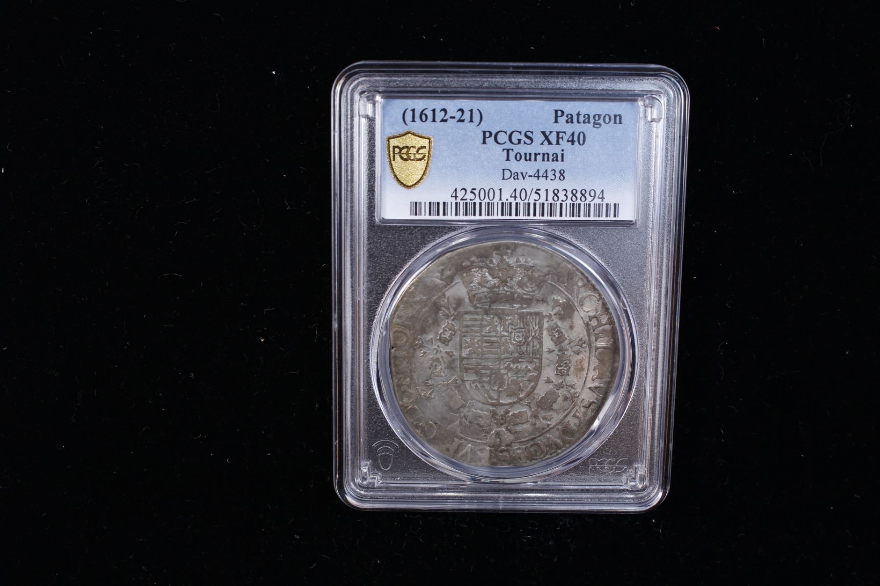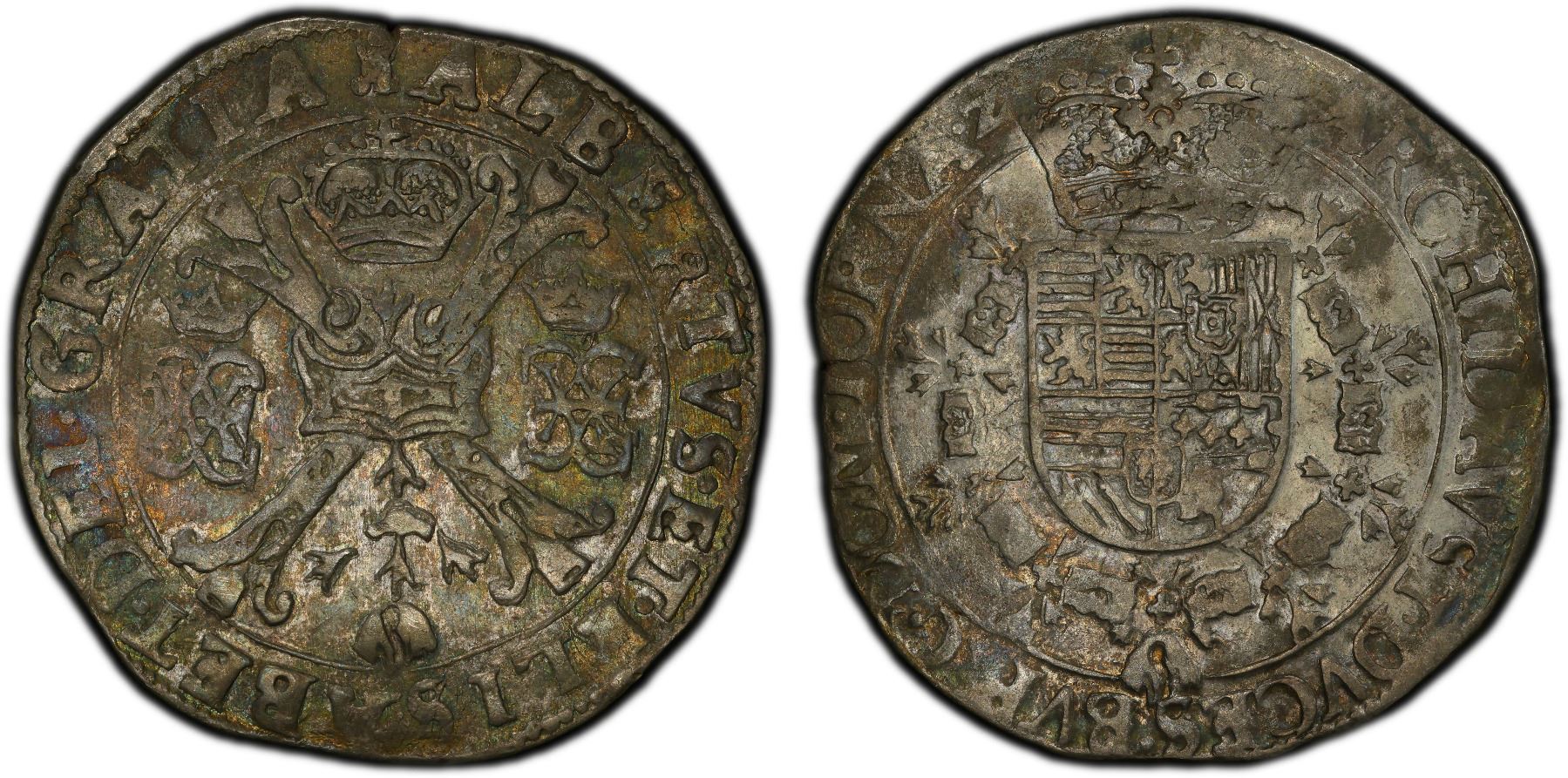 SPANISH NETHERLANDS: Albert & Isabella, 1598-1621, AR patagon, Tournai, ND, KM-31, Dav-4438, crowned cross of Burgundy; in center a firesteel to which is appended the jewel of the Golden Fleece // crowned Habsburg arms, surrounded by the collar of the Golden Fleece, an attractive lightly toned example, PCGS graded EF40.