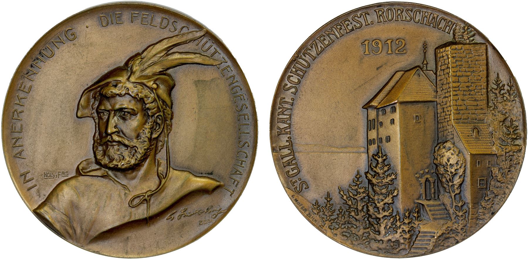 ST. GALLEN: Canton, AE medal, 1912, Richter-1186b, Martin-586b, 45mm bronze medal by Holy Frères, St.-Imier, G. Hofer and G. Stückelber for the St. Gallen Cantonal Shooting Festival in Rorschach; bust of William Tell facing three quarters left // view of the Castle St. Anna exterior on the shore of Lake Constance, date above and perimeter legend above, matte finish, Unc. Listed as "rare" in the Richter catalog.