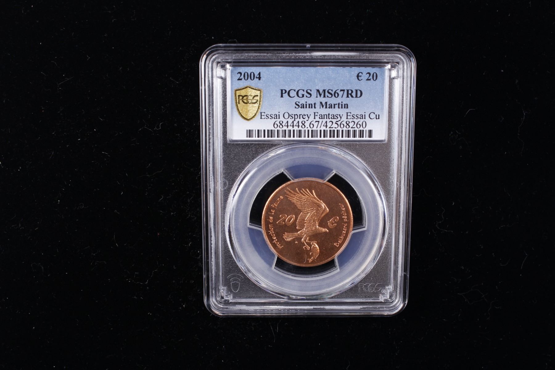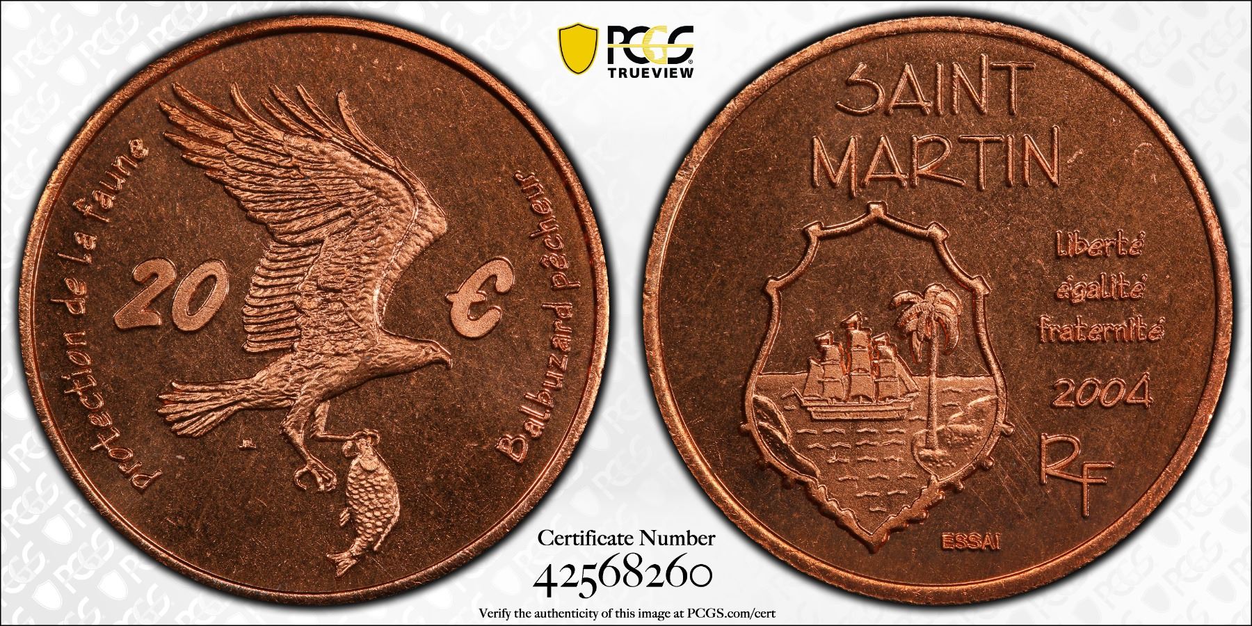 ST. MARTIN: Fantasy Issues, AE 20 euro, 2004, KM-XE15a, Wildlife Conservation Series - Osprey (Balbuzard pêcheur), fantasy pattern essai in pure copper, mintage of only 30 pieces, very rare, PCGS graded MS67 RD. Private pattern struck at the Patrick Mint. The mint began operating in 1972 and was known for striking mainly tokens until the mint was destroyed in the 2017 Tubbs Fire in the "Northern California Firestorm" along with 5,642 other structures in Santa Rosa, California.