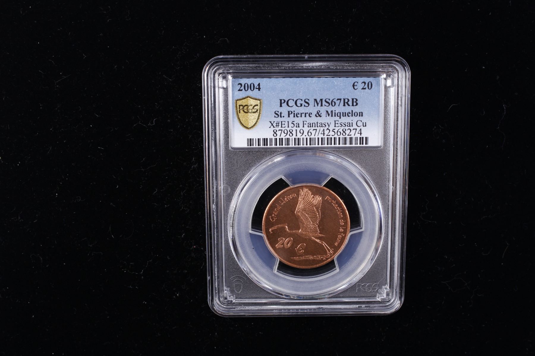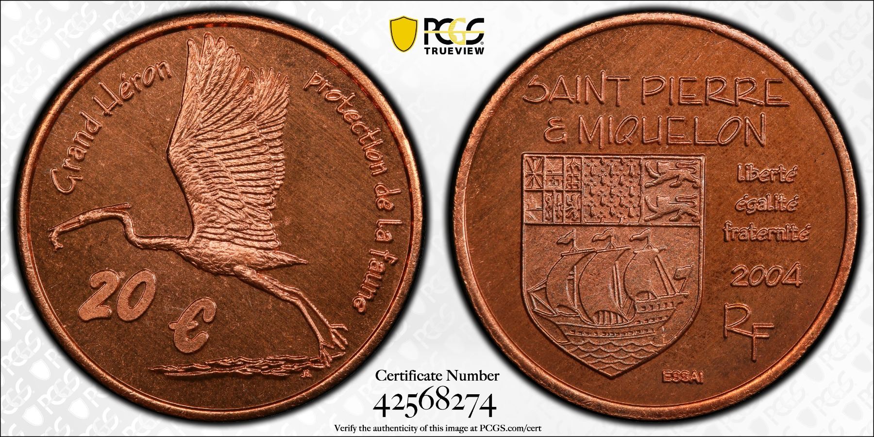 ST. PIERRE & MIQUELON: Fantasy Issues, AE 20 euro, 2004, KM-XE15a, Wildlife Conservation Series - Great Blue Heron, fantasy pattern essai in pure copper, mintage of only 30 pieces, very rare, PCGS graded MS67 RB. Private pattern struck at the Patrick Mint. The mint began operating in 1972 and was known for striking mainly tokens until the mint was destroyed in the 2017 Tubbs Fire in the "Northern California Firestorm" along with 5,642 other structures in Santa Rosa, California.
