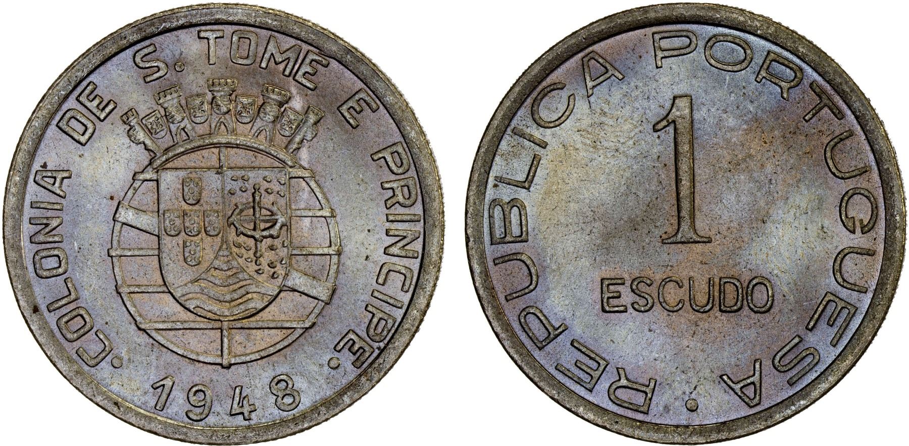 ST. THOMAS & PRINCE: Portuguese Colony, 1 escudo, 1948, KM-9, one-year type, brilliant original luster, Brilliant UNC.