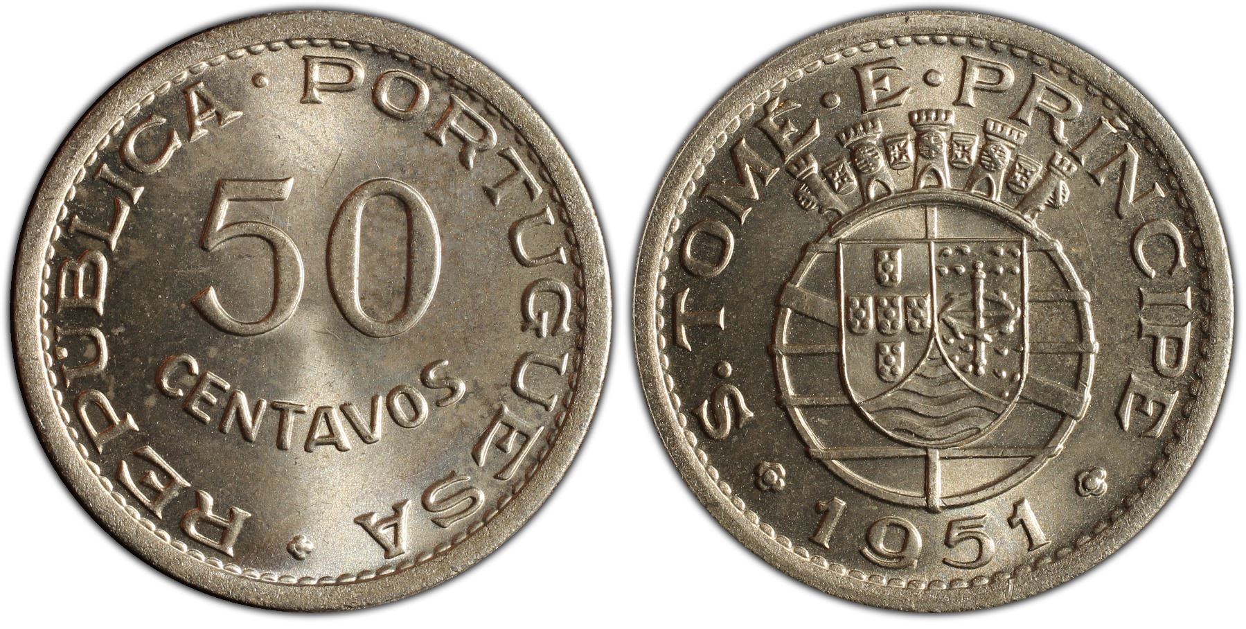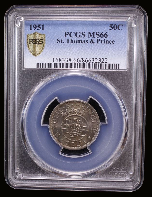 ST. THOMAS & PRINCE: Portuguese Colony, 50 centavos, 1951, KM-10, brilliant cartwheel luster, PCGS graded MS66. Tied for finest example at PCGS (Top Pop: 4/0).