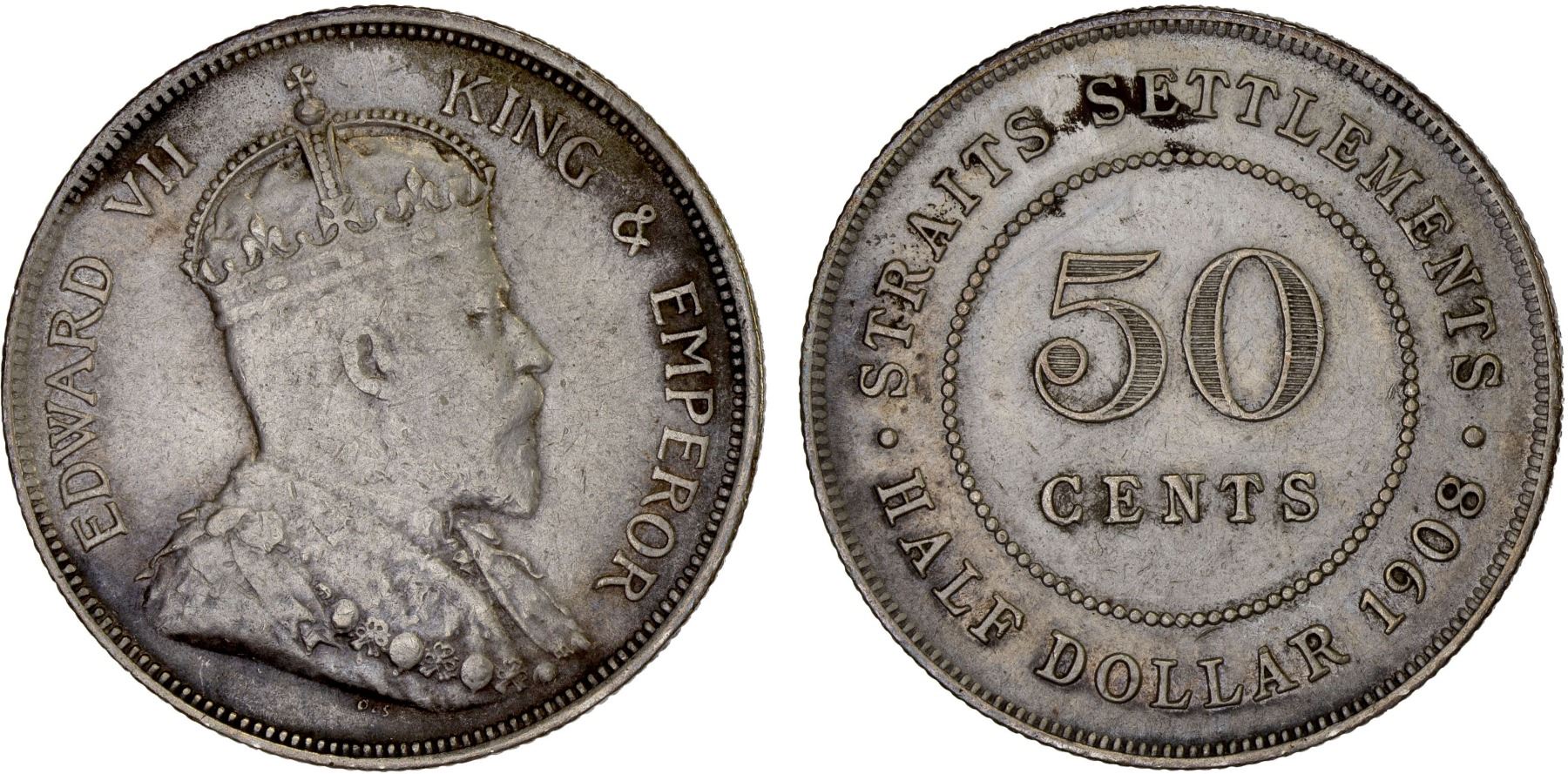 STRAITS SETTLEMENTS: AR 50 cents, 1908, KM-24, VF.