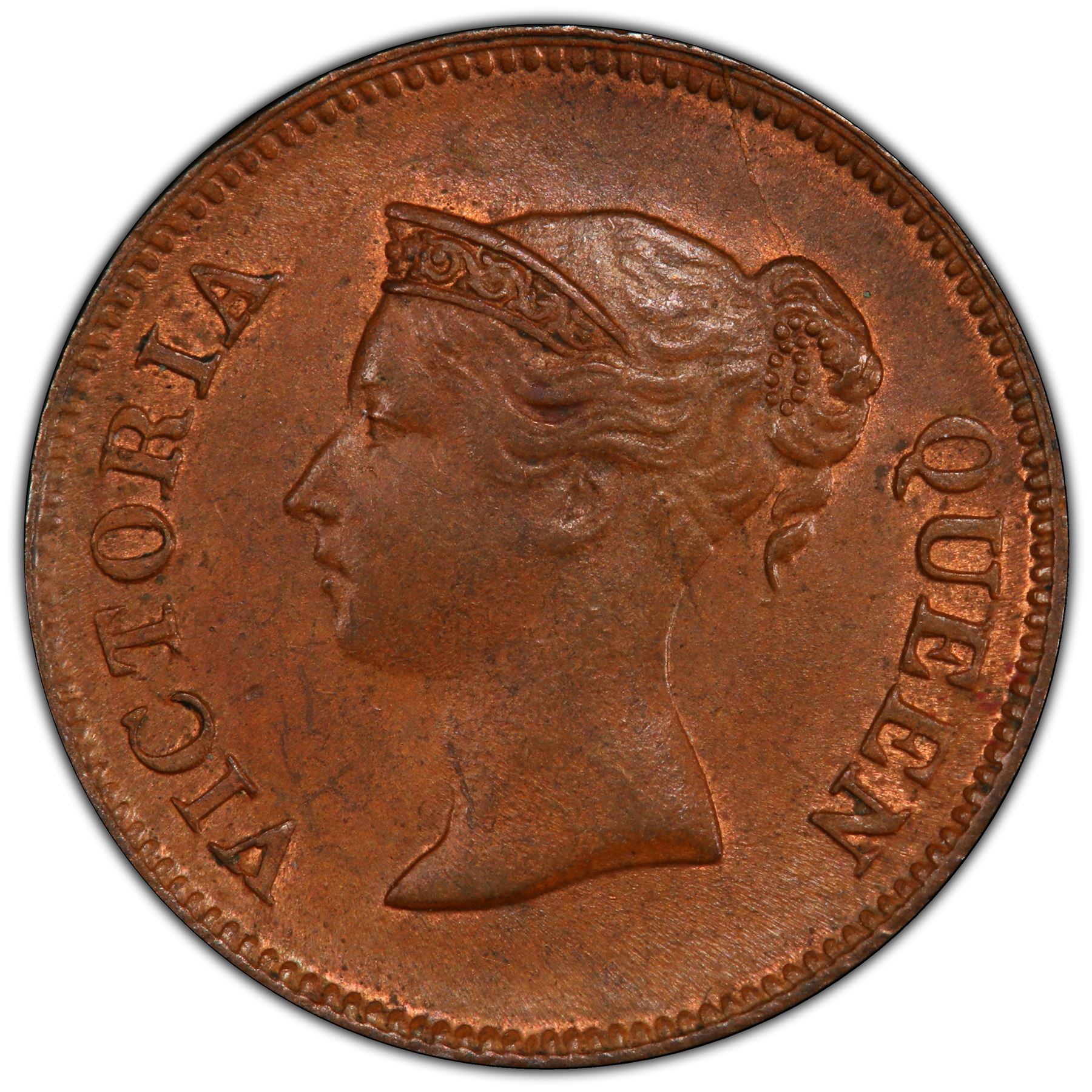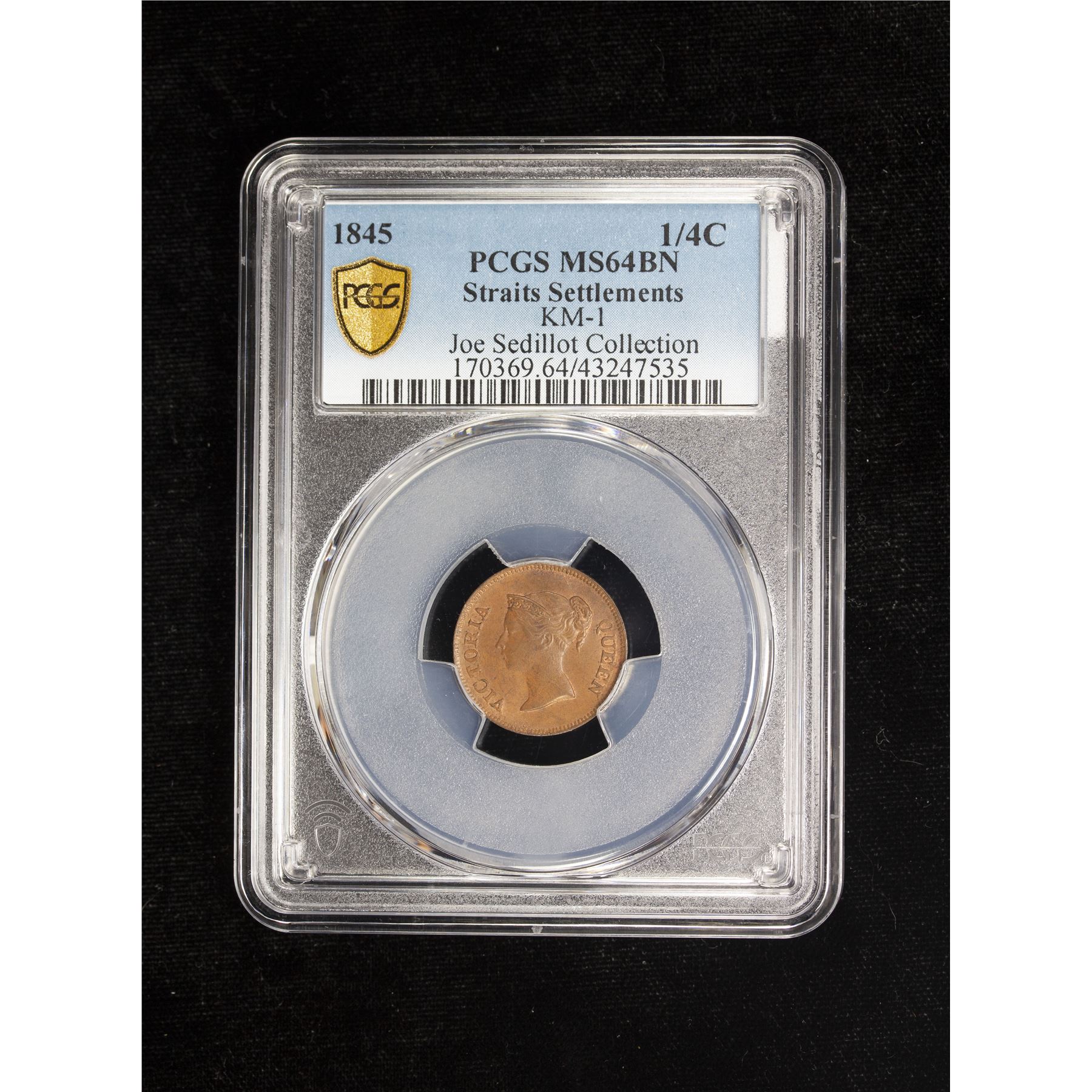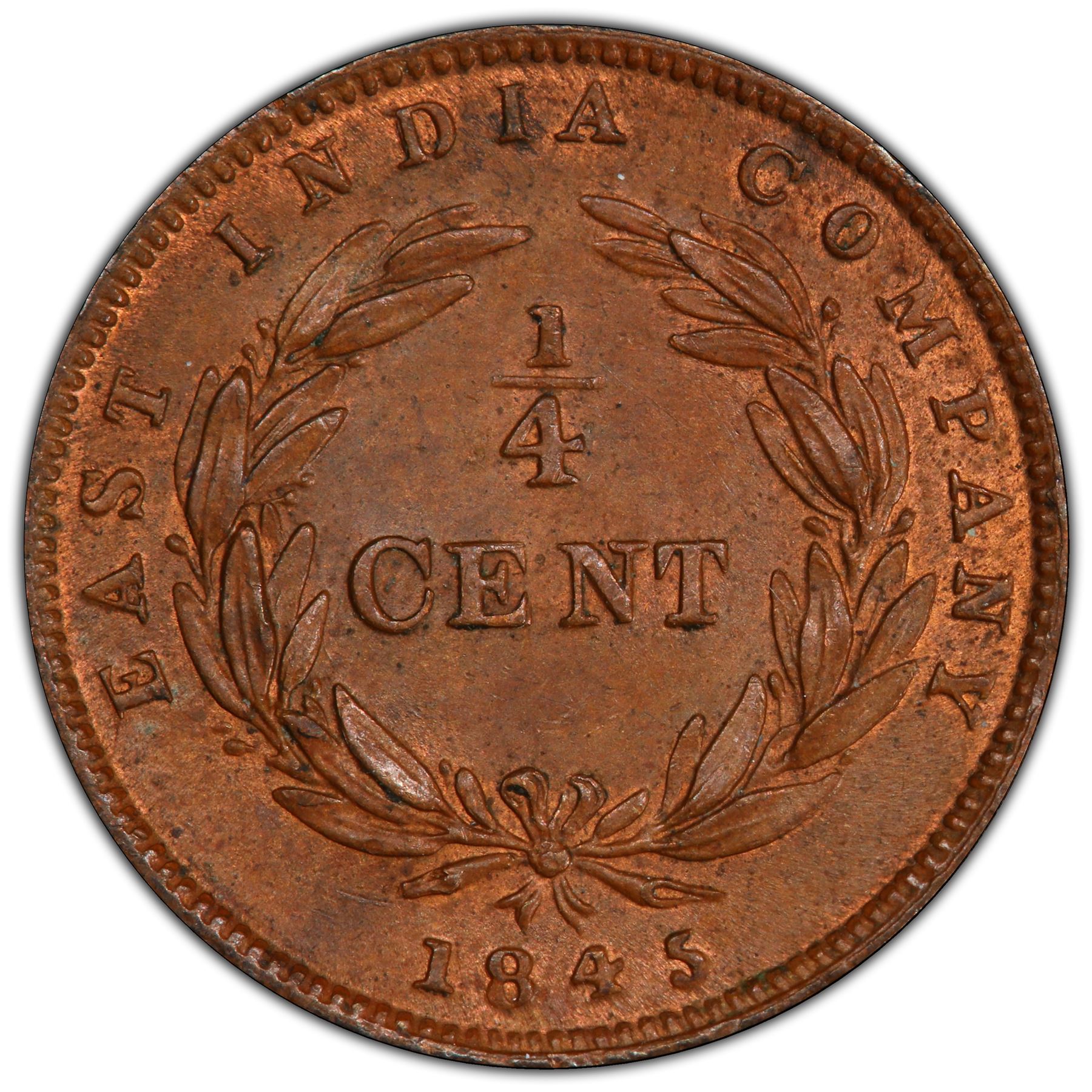 STRAITS SETTLEMENTS: Victoria, 1837-1867, AR ¼ cent, 1845, KM-1, East India Company issue, a wonderful mint state example with traces of original red luster! PCGS graded MS64 BN, ex Joe Sedillot Collection. In 1830, the Straits Settlements became a residency, or subdivision, of the Presidency of Bengal, in British India. This status continued until 1867.