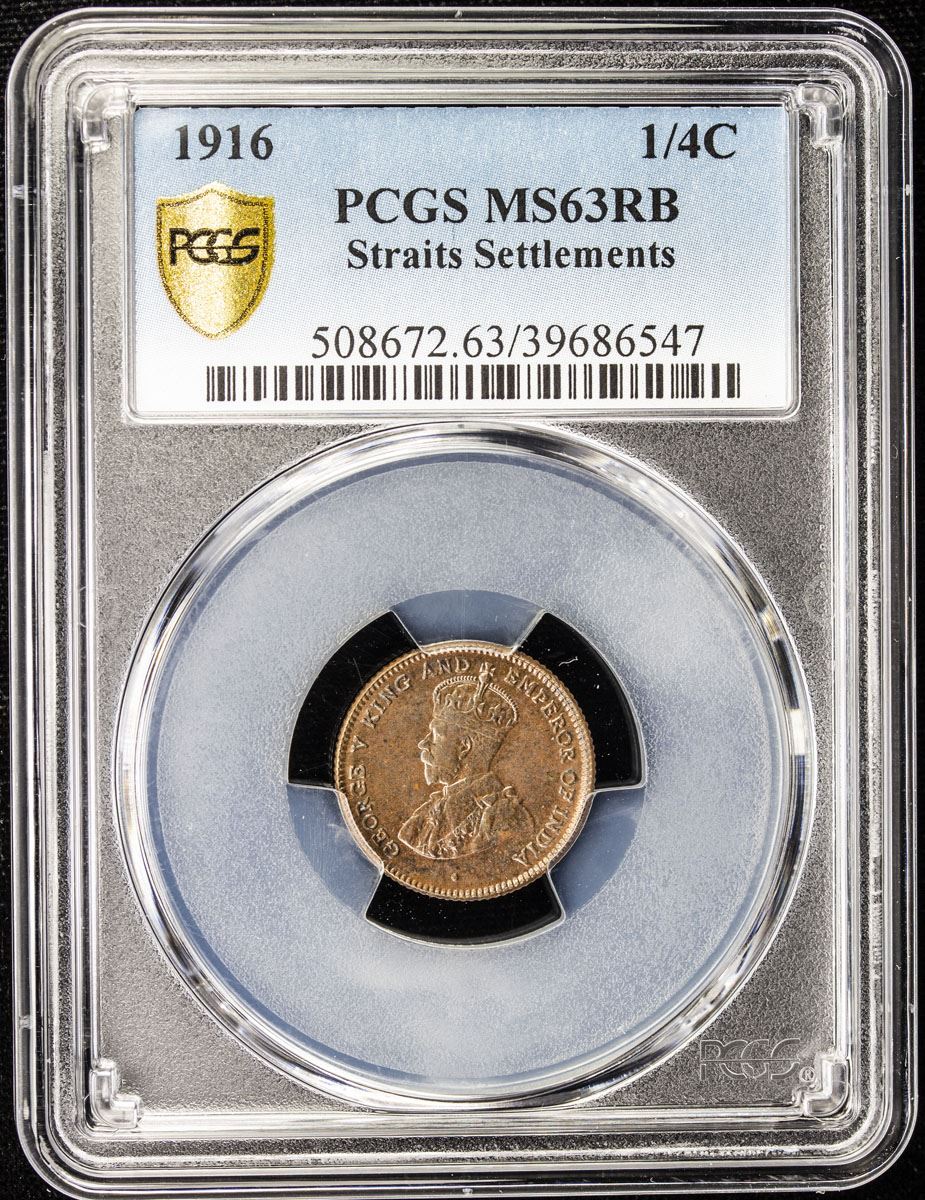 STRAITS SETTLEMENTS: George V, 1910-1936, AE ¼ cent, 1916, KM-27, PCGS graded MS63 RB.