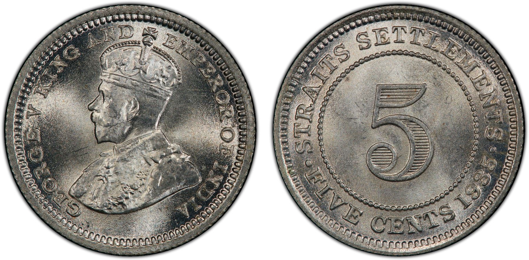 STRAITS SETTLEMENTS: George V, 1910-1936, AR 5 cents, 1935, KM-36, a stunning lustrous mint state example! PCGS graded MS67.