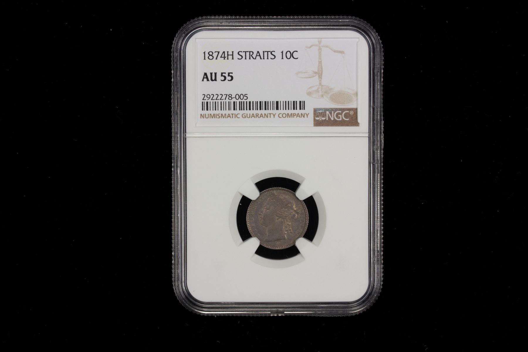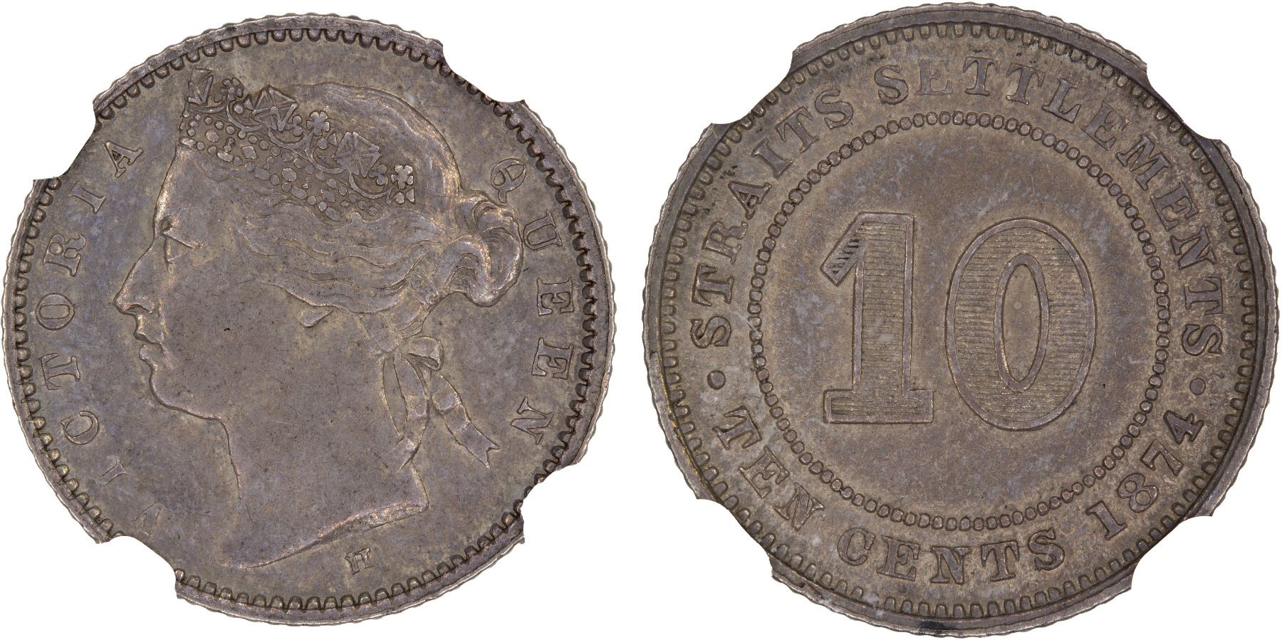 STRAITS SETTLEMENTS: Victoria, 1867-1901, AR 10 cents, 1874-H, KM-11, NGC graded AU55. On April 1, 1867 the Settlements became a British Crown colony, making the Settlements answerable directly to the Colonial Office in London instead of the government of British India based in Calcutta.