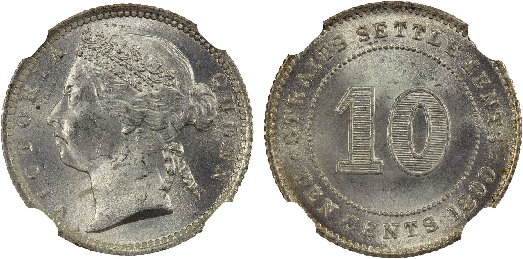 STRAITS SETTLEMENTS: Victoria, 1867-1901, AR 10 cents, 1899, KM-11, Prid-107, a lovely lustrous mint state example! NGC graded MS63. On April 1, 1867 the Settlements became a British Crown colony, making the Settlements answerable directly to the Colonial Office in London instead of the government of British India based in Calcutta.