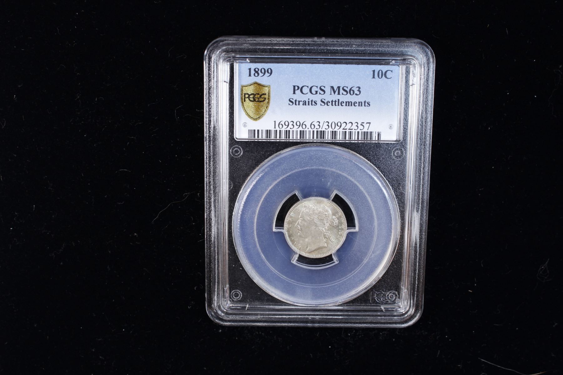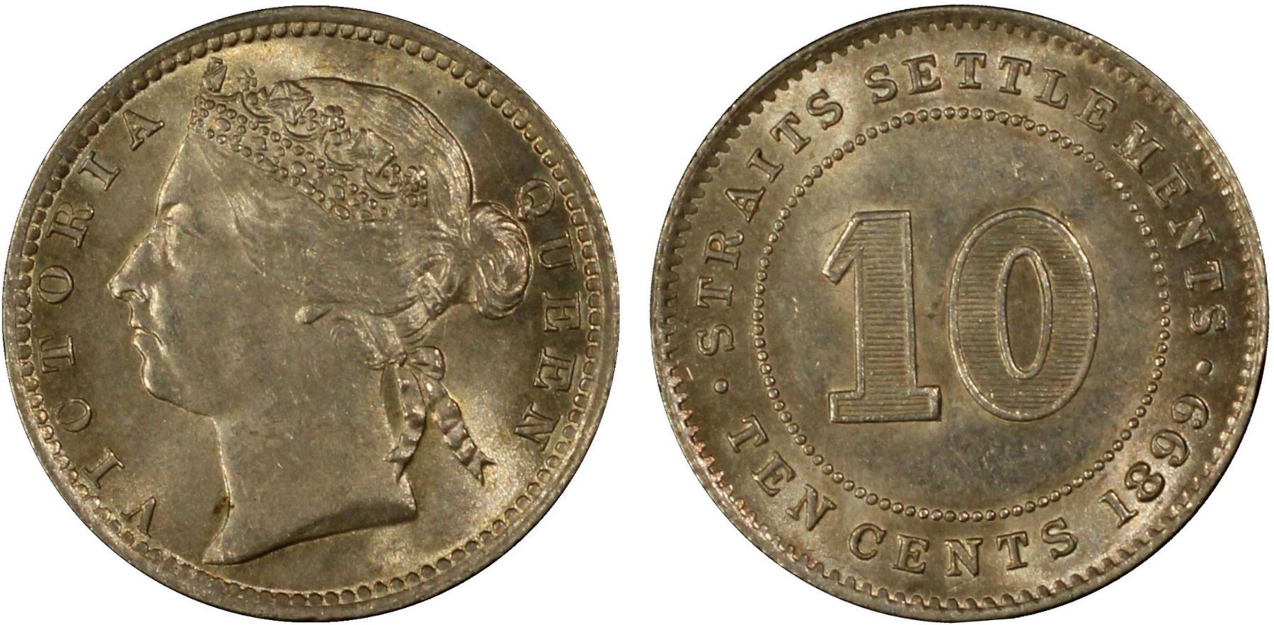 STRAITS SETTLEMENTS: Victoria, 1867-1901, AR 10 cents, 1899, KM-11, Prid-107, a lovely lustrous mint state example! PCGS graded MS63. On April 1, 1867 the Settlements became a British Crown colony, making the Settlements answerable directly to the Colonial Office in London instead of the government of British India based in Calcutta.