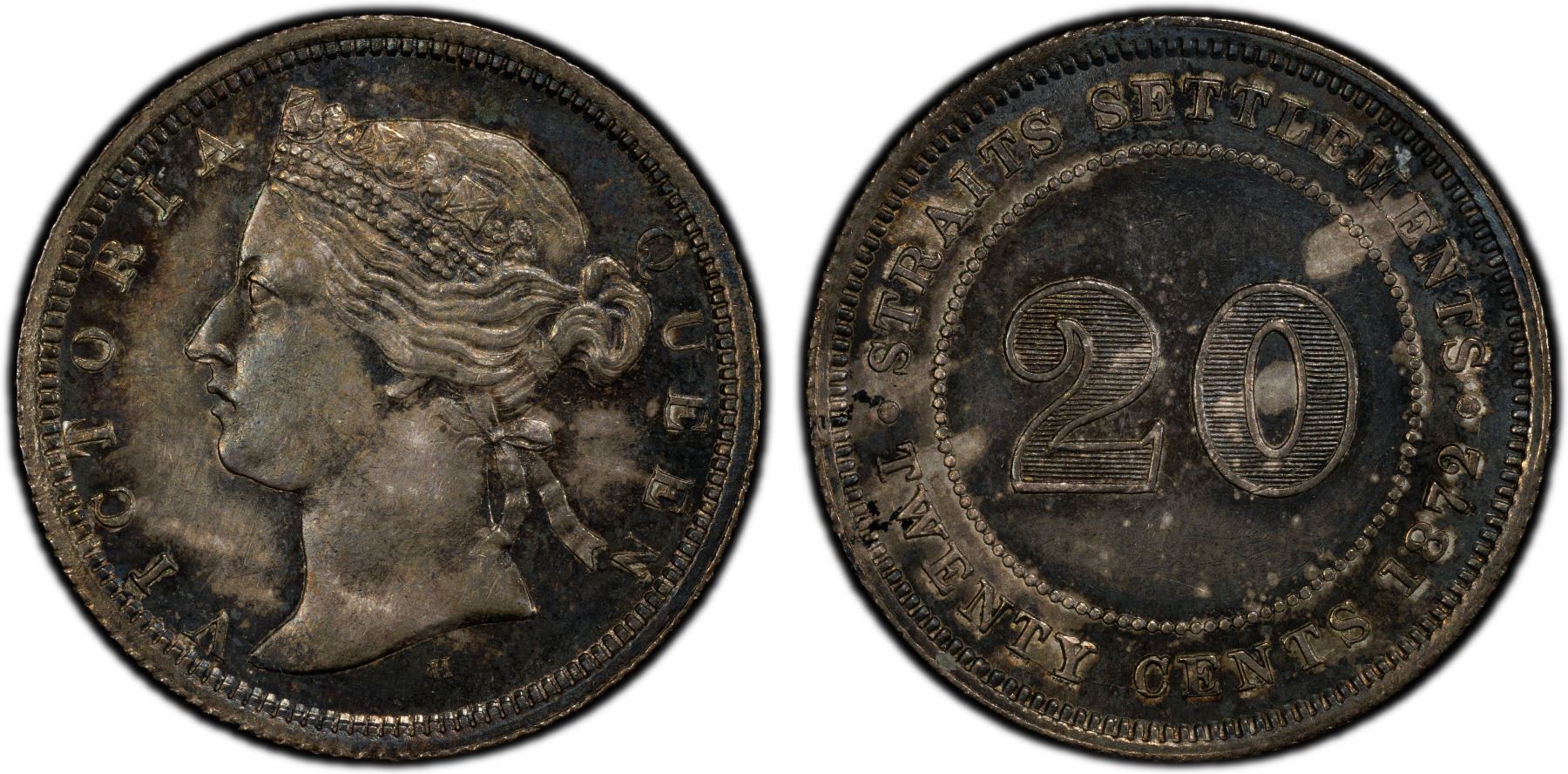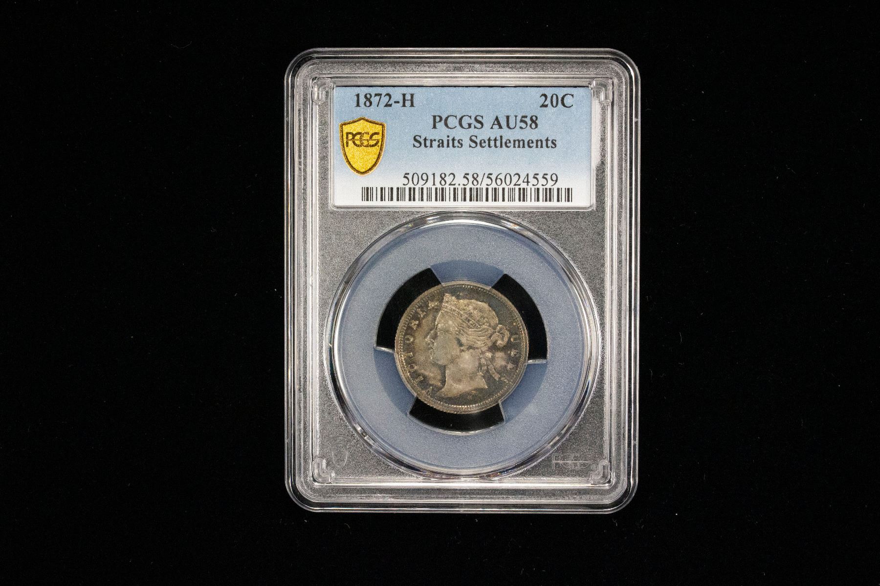 STRAITS SETTLEMENTS: Victoria, 1867-1901, AR 20 cents, 1872-H, KM-12, an attractive toned nearly mint state example, PCGS graded AU58. On April 1, 1867 the Settlements became a British Crown colony, making the Settlements answerable directly to the Colonial Office in London instead of the government of British India based in Calcutta.