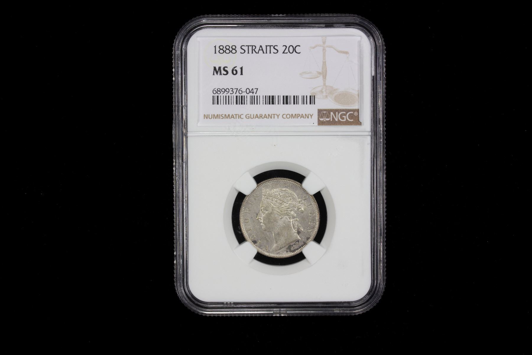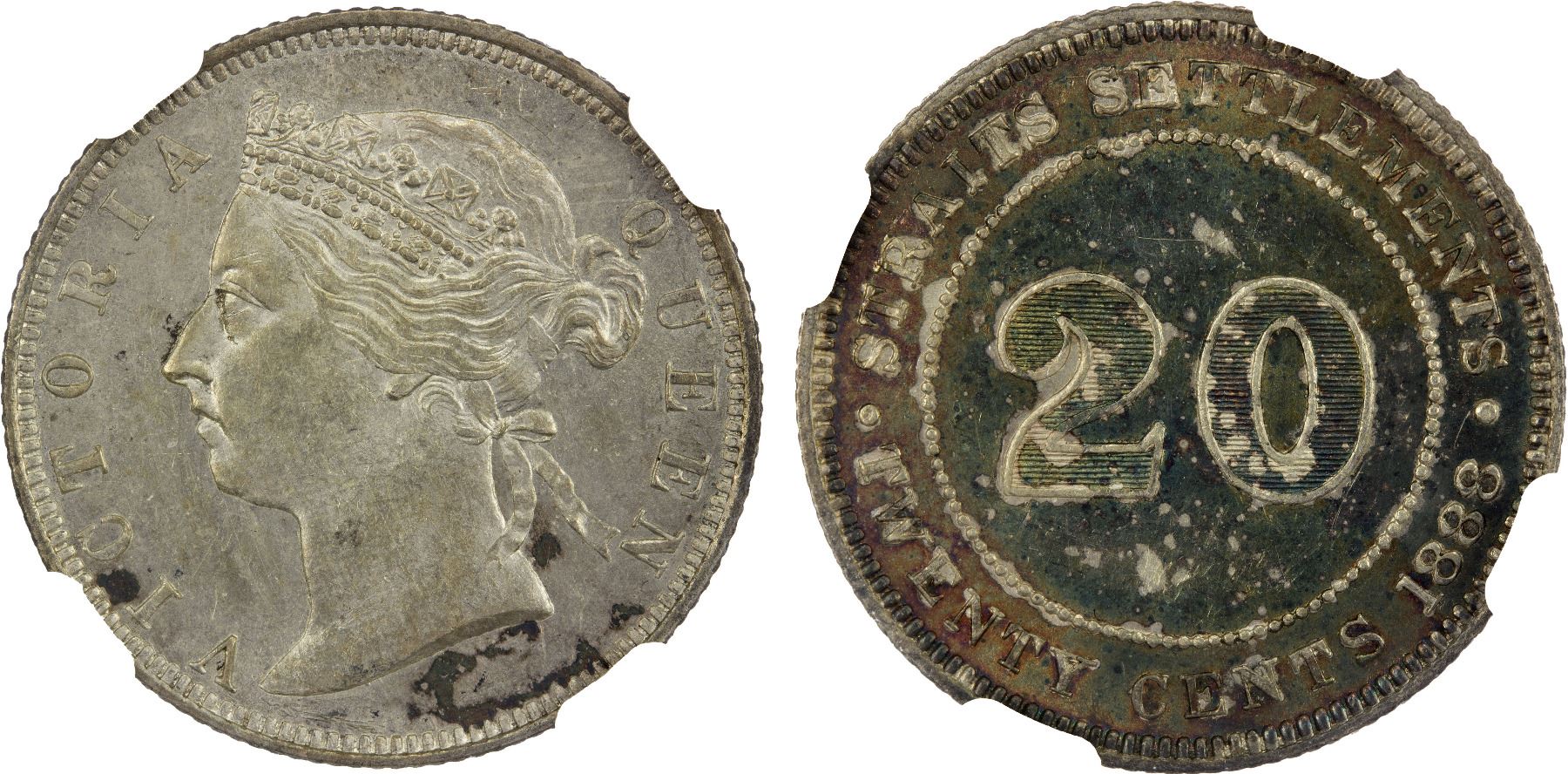 STRAITS SETTLEMENTS: Victoria, 1867-1901, AR 20 cents, 1888, KM-12, Prid-55, a pleasing lustrous mint state example, NGC graded MS61. On April 1, 1867 the Settlements became a British Crown colony, making the Settlements answerable directly to the Colonial Office in London instead of the government of British India based in Calcutta.