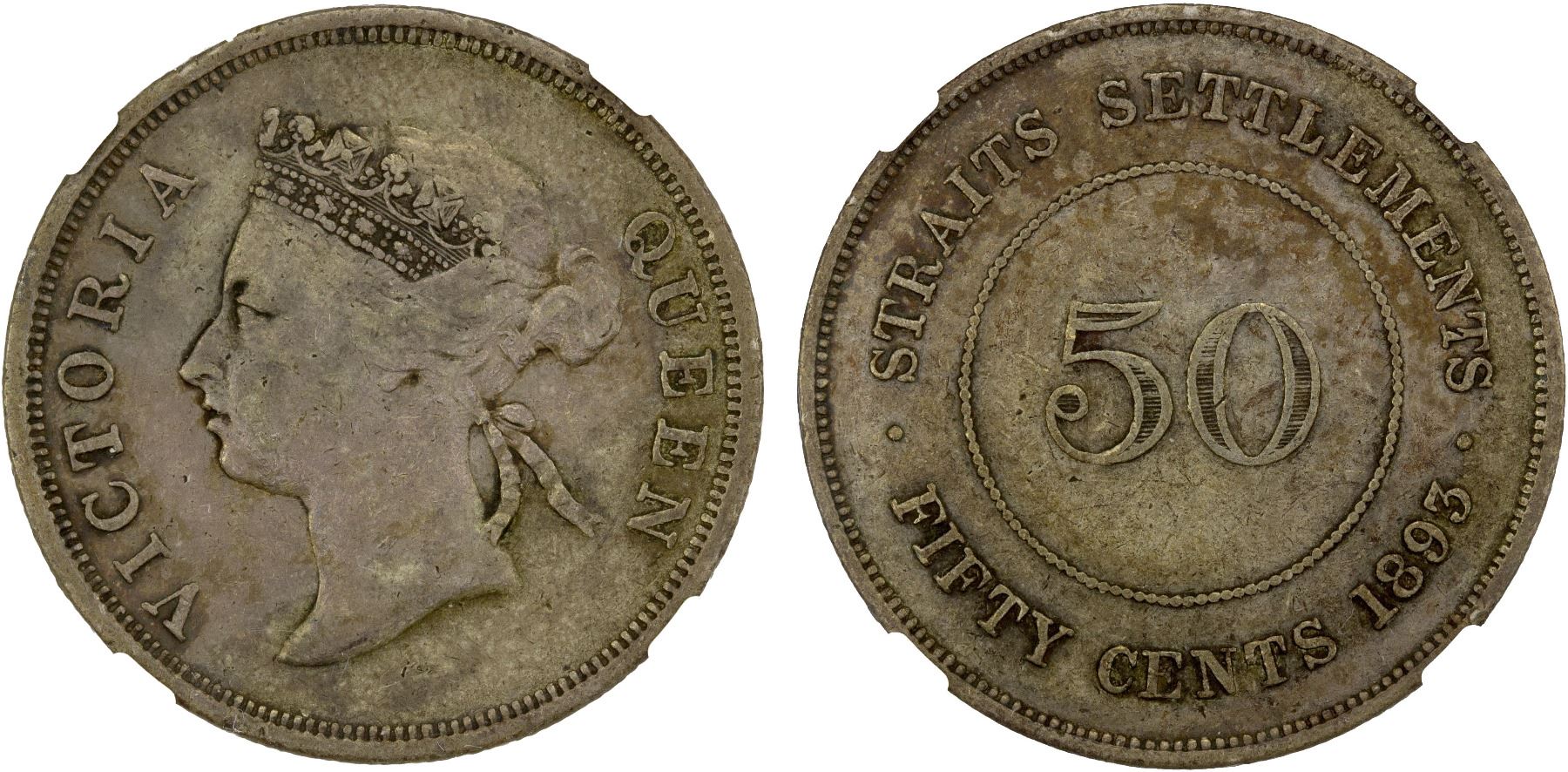 STRAITS SETTLEMENTS: Victoria, 1867-1901, AR 50 cents, 1893, KM-13, NGC graded VF35. On April 1, 1867 the Settlements became a British Crown colony, making the Settlements answerable directly to the Colonial Office in London instead of the government of British India based in Calcutta.