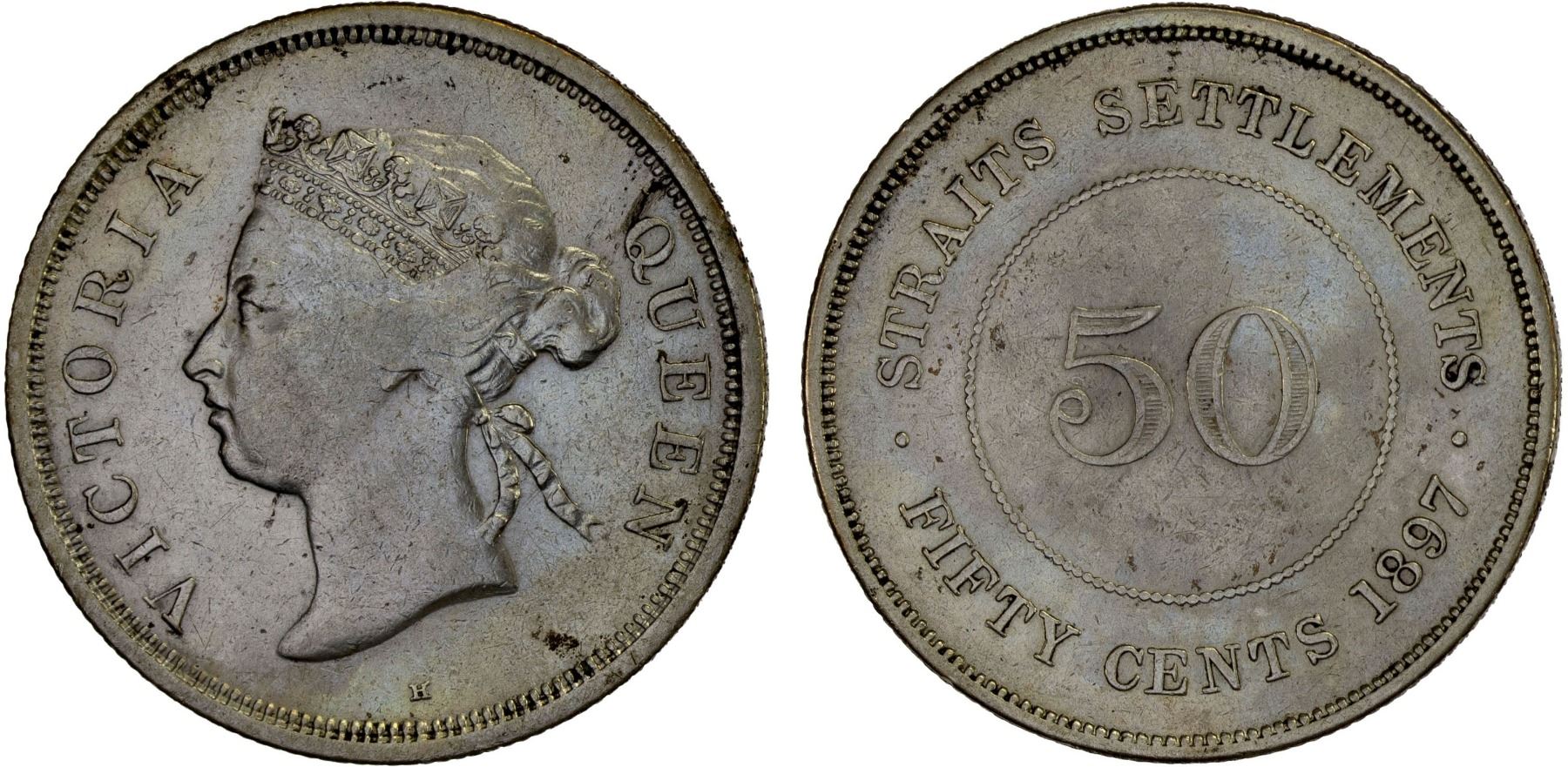 STRAITS SETTLEMENTS: Victoria, 1867-1901, AR 50 cents, 1897-H, KM-13, cleaned, F-VF. On April 1, 1867 the Settlements became a British Crown colony, making the Settlements answerable directly to the Colonial Office in London instead of the government of British India based in Calcutta.