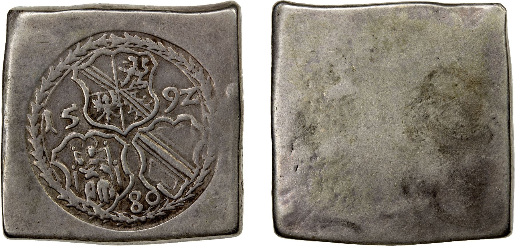STRASSBURG (BISHOPRIC): AR 80 kreuzer (28.91g), 159Z, Mailliet-70.2, Korchnak-561, uniface Siege klippe issue (33mm), three-fold shield of Johann Georg between "15" and "9Z" and above "80", VF, ex Joe Sedillot Collection. According to Korchnak, when the new Protestant majority installed one of their own as bishop, the Catholics laid siege to Strassburg (Strasbourg). After a period of fighting, the siege was lifted when King Henri IV of France (being a recent Protestant convert himself) intervened. These coins were made from the silver services of wealthier citizens.