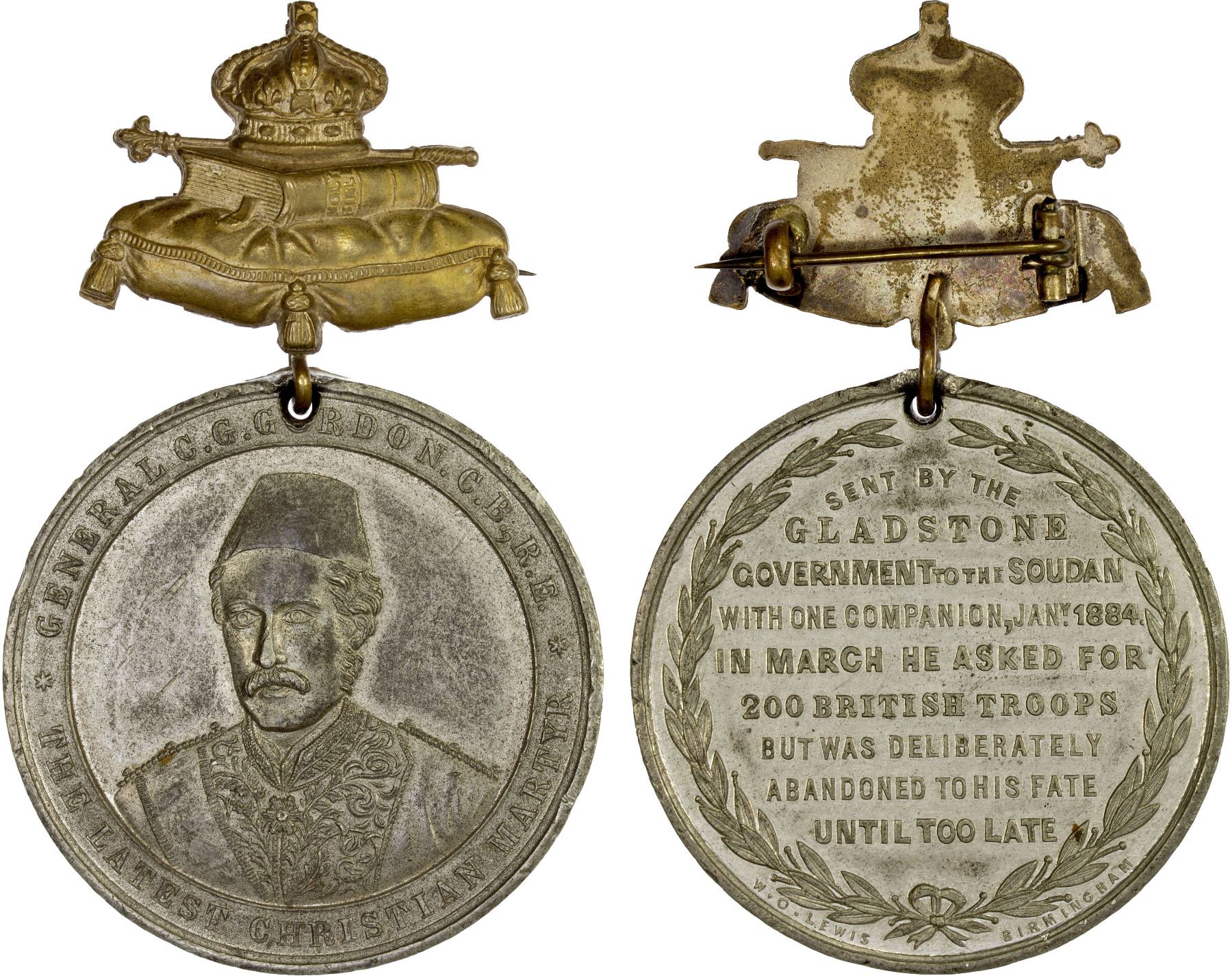 SUDAN: Anglo-Egyptian Condominium, medal (38.43g), 1885, BHM-3187, Eimer-1714, 45mm white metal medal on the Death of Major General Charles George "Chinese" Gordon by W. O. Lewis, Birmingham, bust of UNIFORMED Gordon slightly left wearing fez with GENERAL C.G.GORDON C.B., R.B. - THE LATEST CHRISTIAN MARTYR around // SENT BY THE / GLADSTONE / GOVERNMENT TO THE SOUDAN / WITH ONE COMPANION, JANy. 1884 / IN MARCH HE ASKED FOR / 200 BRITISH TROOPS / BUT WAS DELIBERATELY / ABANDONED TO HIS FATE / UNTIL TOO LATE, all within laurel wreath, holed for suspension, with silvered brass crown and bible hanger above, lightly cleaned reverse, scarce, plain edge, XF. Charles George Gordon (1833-1885), also known as Chinese Gordon and Gordon Pasha, was a British Army officer and administrator remembered for his exploits in China and Egypt. He was the commander of the Egyptian forces in Khartoum when the city was besieged by the forces of al-Mahdi on March 18, 1884. The siege lasted ten months until the city fell on January 26, 1885. Gordon was killed along with the entire defense force and several thousand civilians. When news broke of Gordon's death, the British public lionized him as a martyr and a hero and decried the government's belated relief effort, which only arrived two days after the city had been captured.