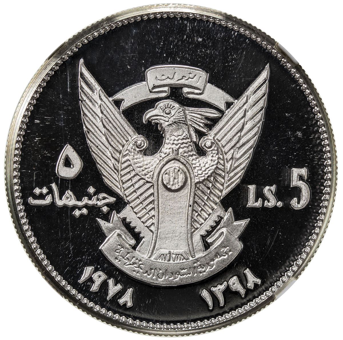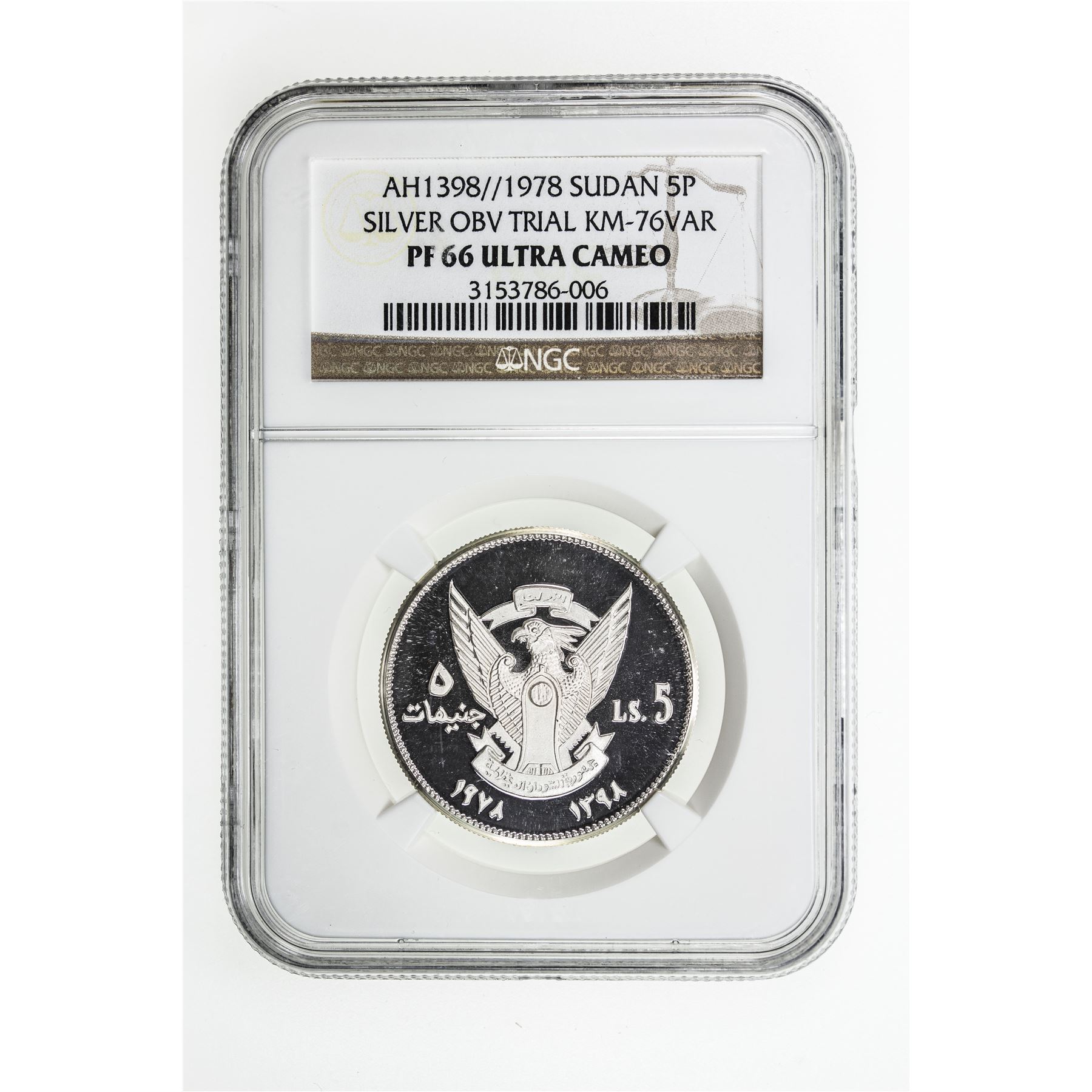 SUDAN: Democratic Republic, AR 10 pounds, 1978/AH1398, KM-76 var, Organization of African Unity Summit in Khartoum, uniface silver pattern of KM-76 obverse, PRUEBA on reverse, NGC graded PF66 UC.