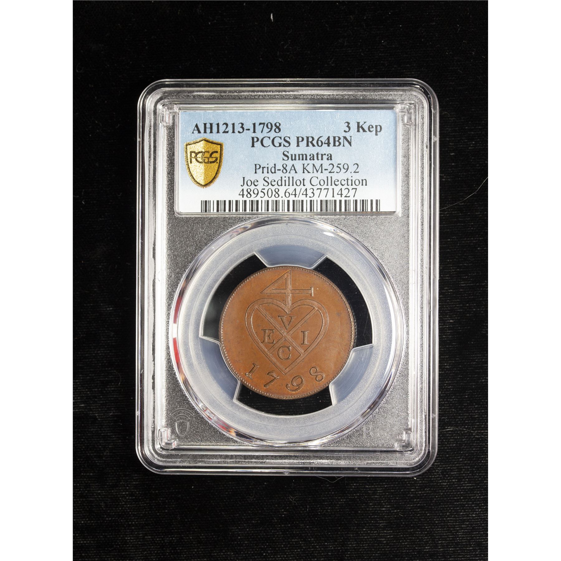 SUMATRA: AE 3 keping, 1787/AH1202, KM-259.2, Prid-8A, East India Company issue struck at the Soho mint, Birmingham, England, PCGS graded Proof 64 BN, ex Joe Sedillot Collection.