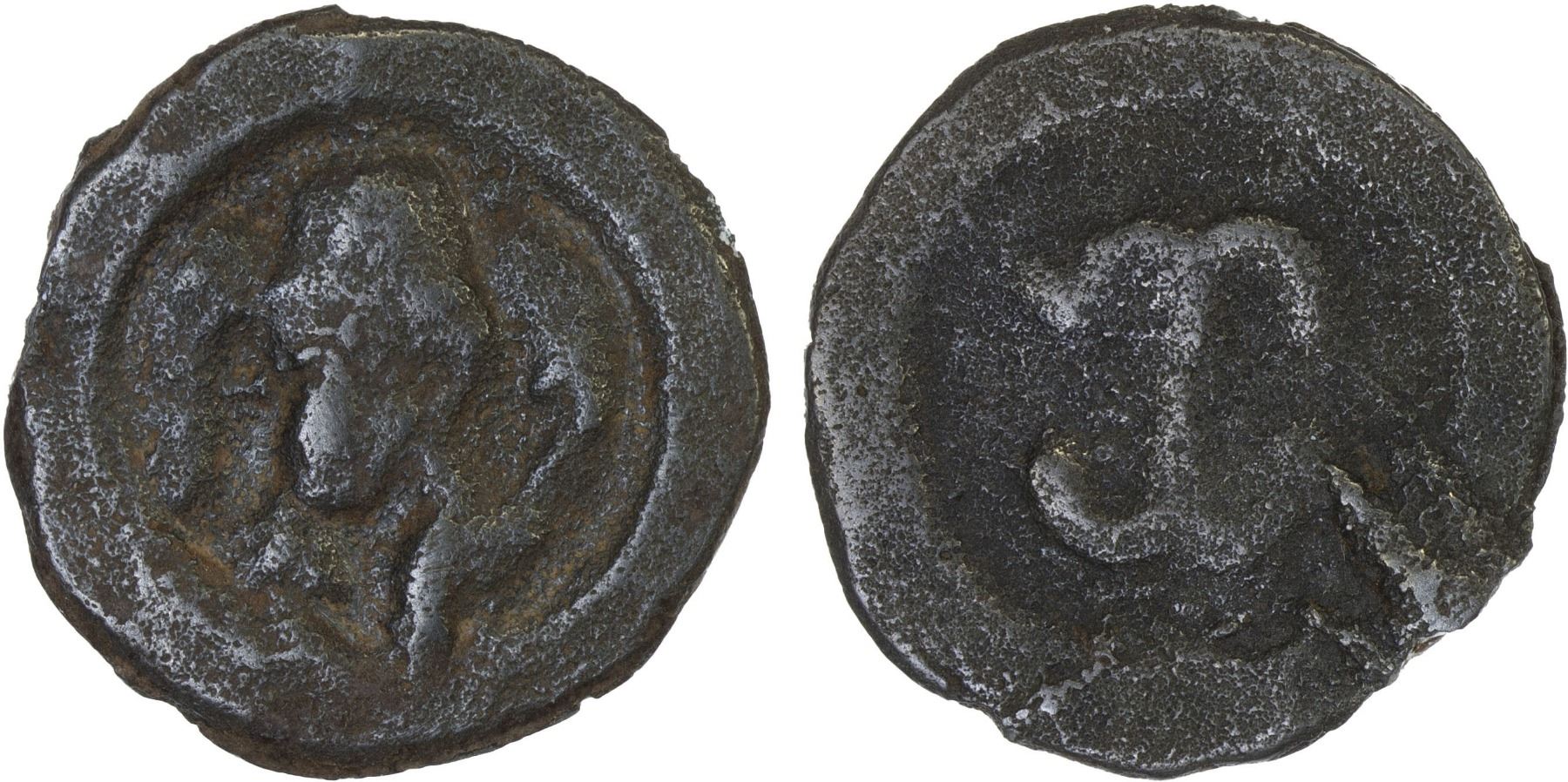 SUYAB: Anonymous, probably 8th century, AE cash (2.33g), Kam-20, Zeno-6305, bust 3/4 left, with long earrings, Sogdian bgy (vaghi) "lord" to left and prn (farn) "glory" to right // tamgha with two hooks, crude VF, RR. Suyab was a quasi-independent city within the Semirech'e territories and a one-time military outpost of the Tang Dynasty, east of Bishkek. The great Chinese poet, Li Bai (Li Po), was born in 701 in the city according to many accounts.
