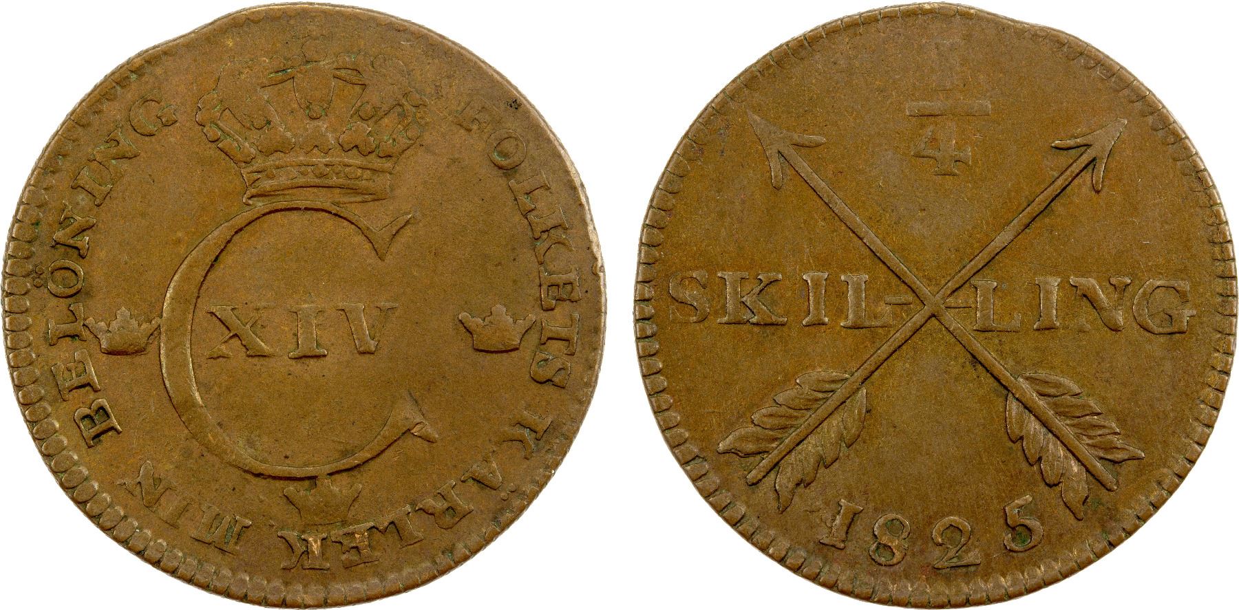 SWEDEN: Carl XIV Johan, 1818-1844, AE ¼ skilling, 1825, EF