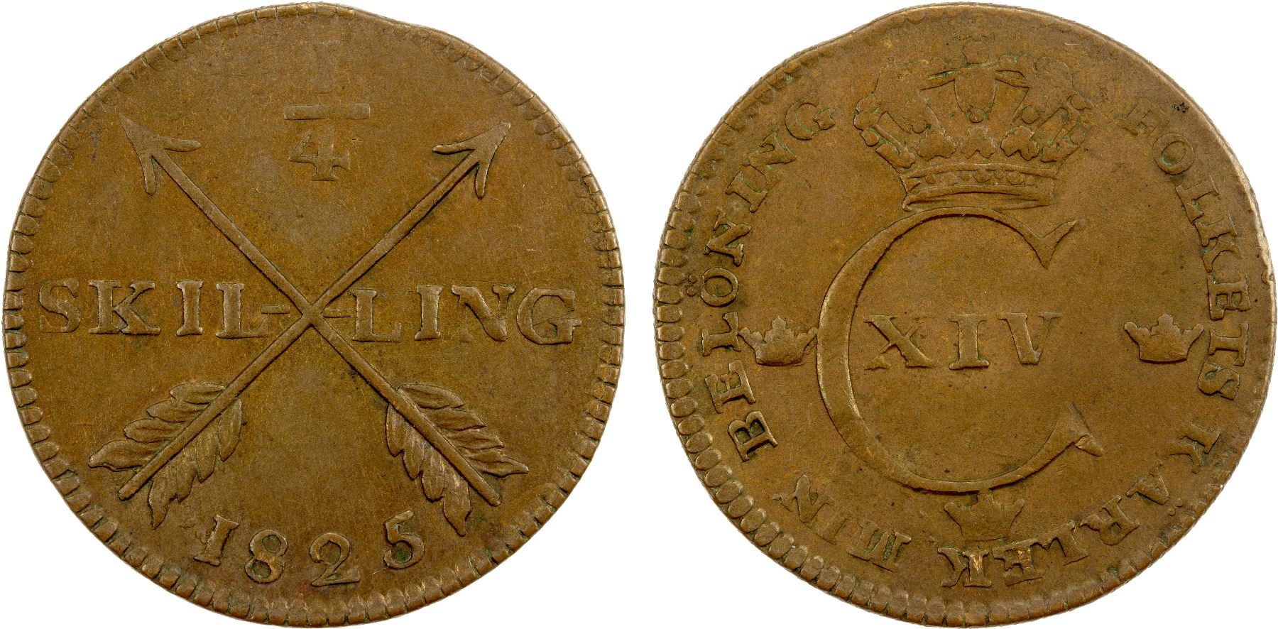 SWEDEN: Carl XIV Johan, 1818-1844, AE ¼ skilling, 1825, XF