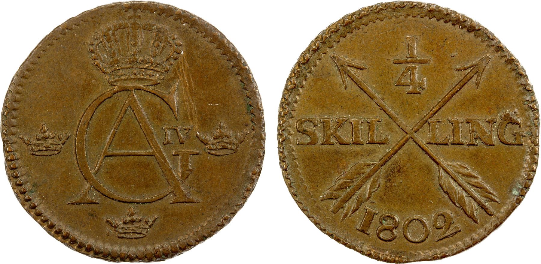 SWEDEN: Gustaf IV Adolf, 1792-1809, AE ¼ skilling, 1802, AU