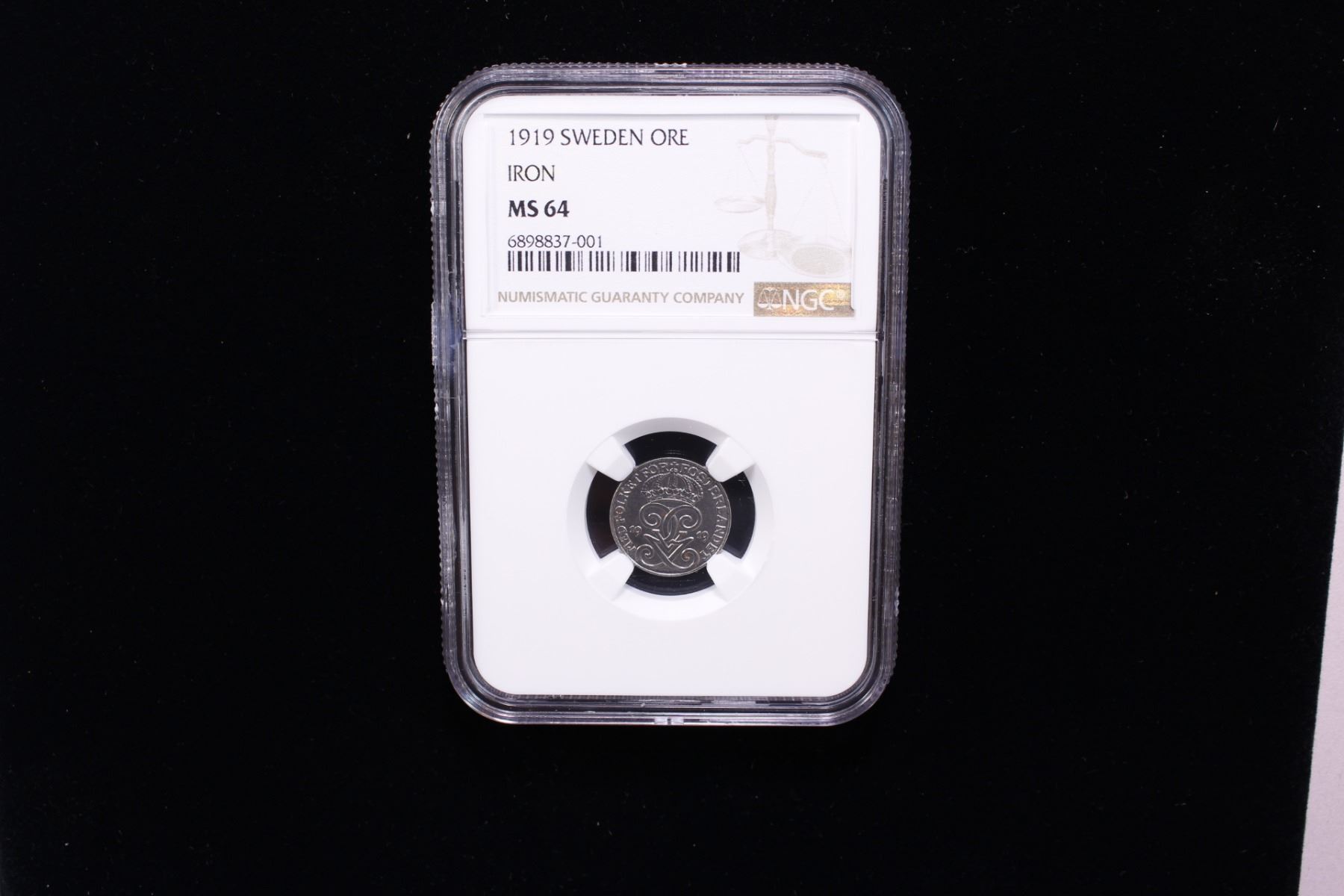 SWEDEN: Gustaf V, 1907-1950, 1 ore, 1919, KM-789, MIS-3a, a wonderful mint state example! NGC graded MS64. This type was minted in iron to replace those in bronze, due to metal shortages during and after World War I.
