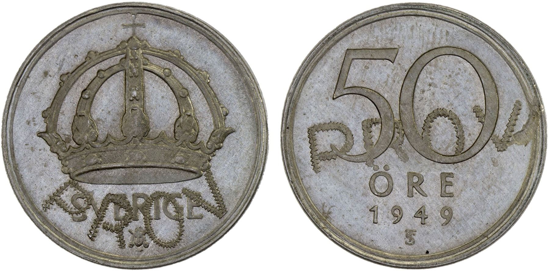 SWEDEN: Gustaf V, 1907-1950, 50 öre, 1949, KM-PnA126, prov issue in aluminum, small gouge on reverse, lustrous, Unc.
