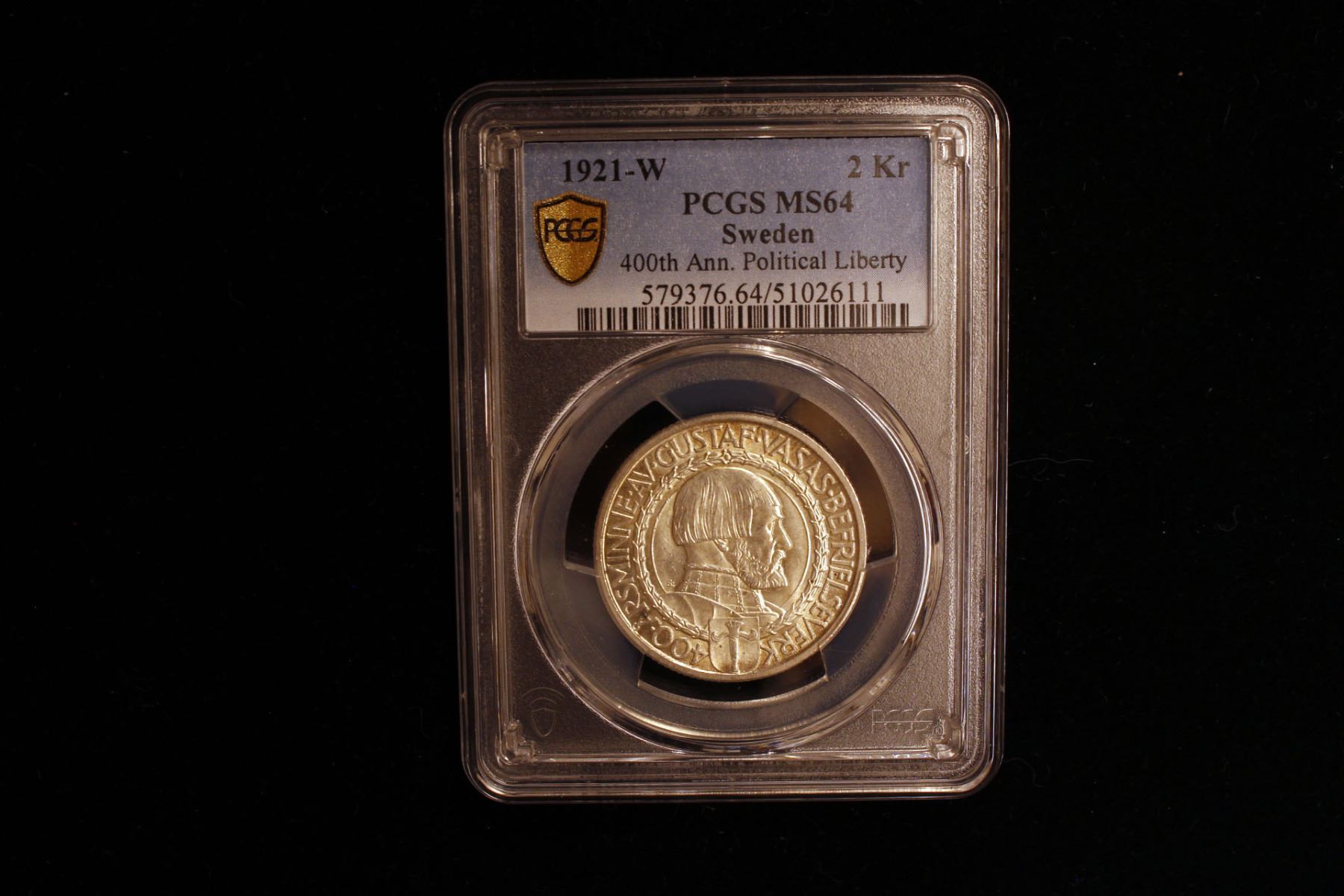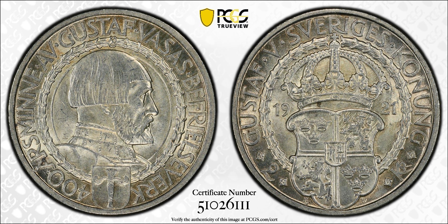 SWEDEN: Gustaf V, 1907-1950, AR 2 kronor, 1921, KM-799, Karl-August Wallroth, Mint Master, 400th Anniversary of Gustaf Vasa's Liberation War, a wonderful example, PCGS graded MS64, ex Dr. Robert A. Rosenfeld Collection.