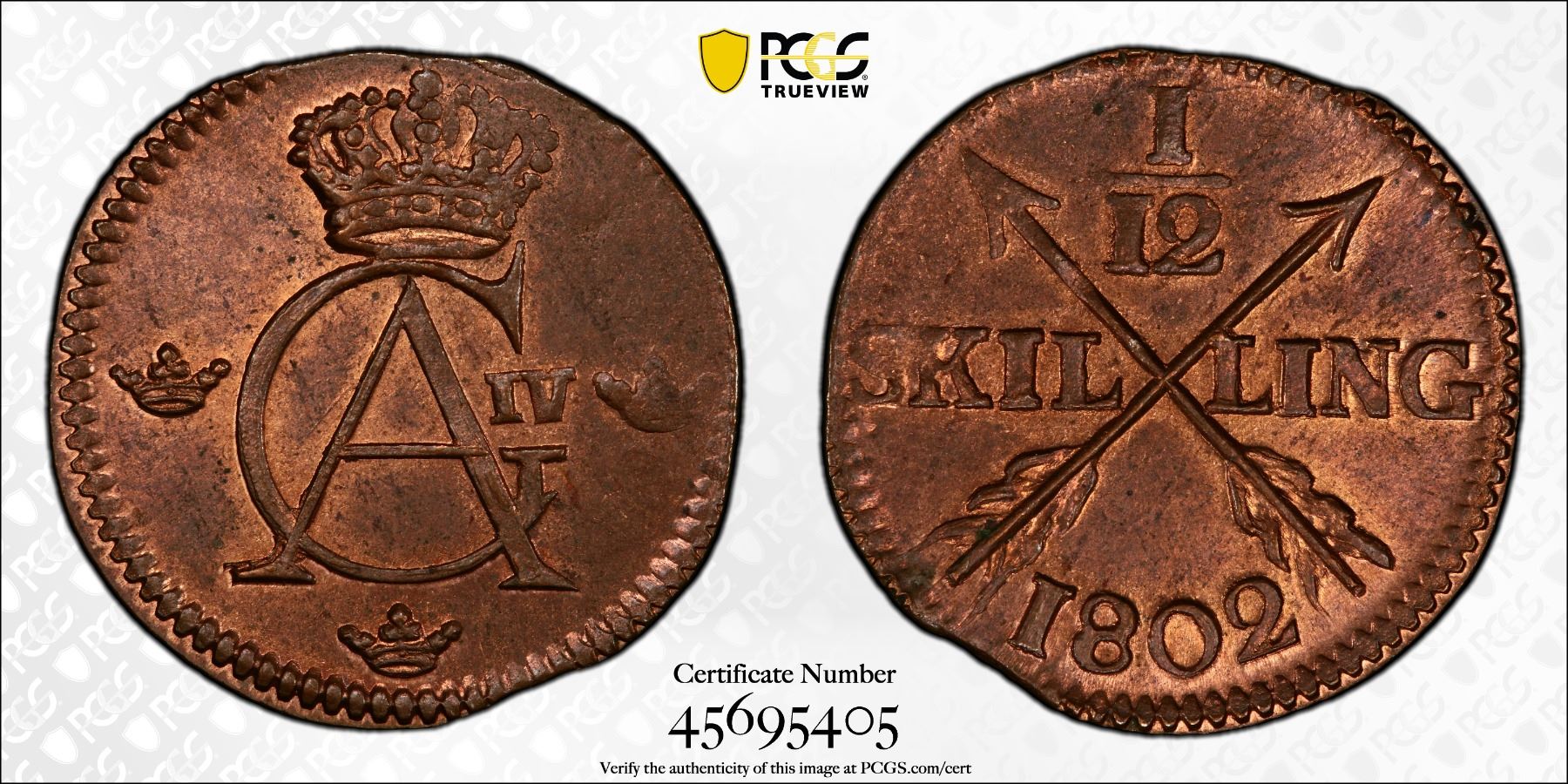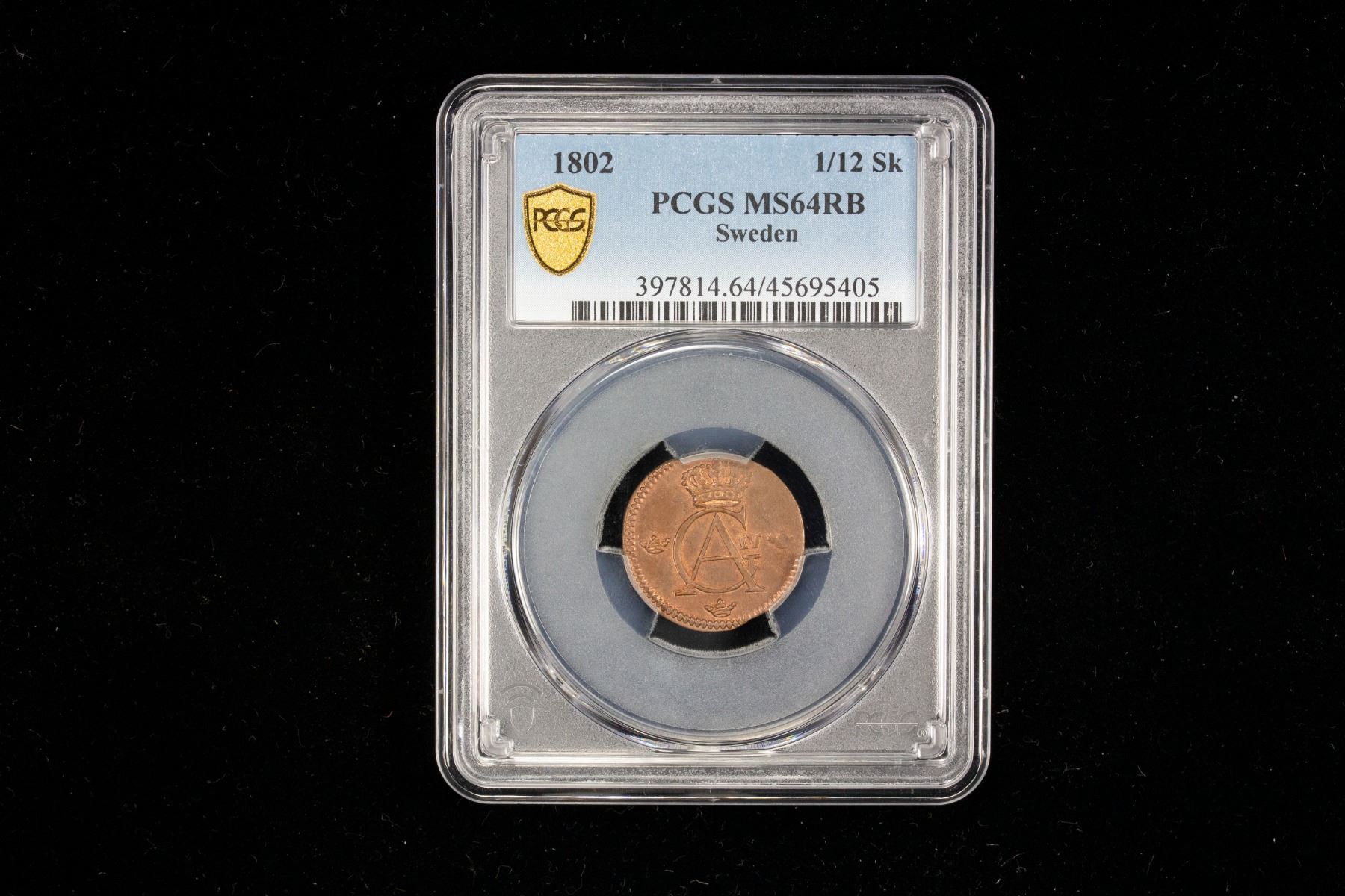 SWEDEN: Gustav IV Adolf, 1792-1809, AE 1/12 skilling, Avesta, 1802, PCGS MS64 RB