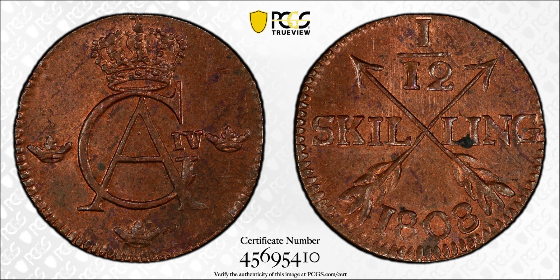 SWEDEN: Gustav IV Adolf, 1792-1809, AE 1/12 skilling, Avesta, 1808, PCGS MS63 RB