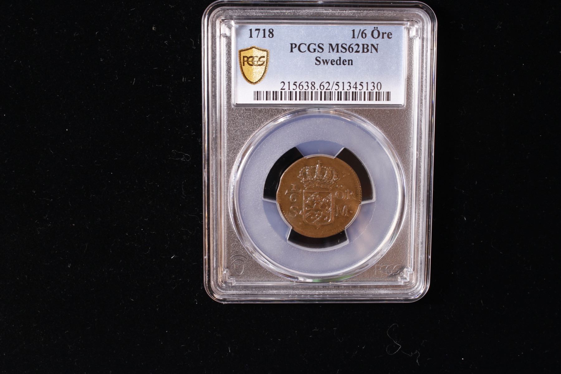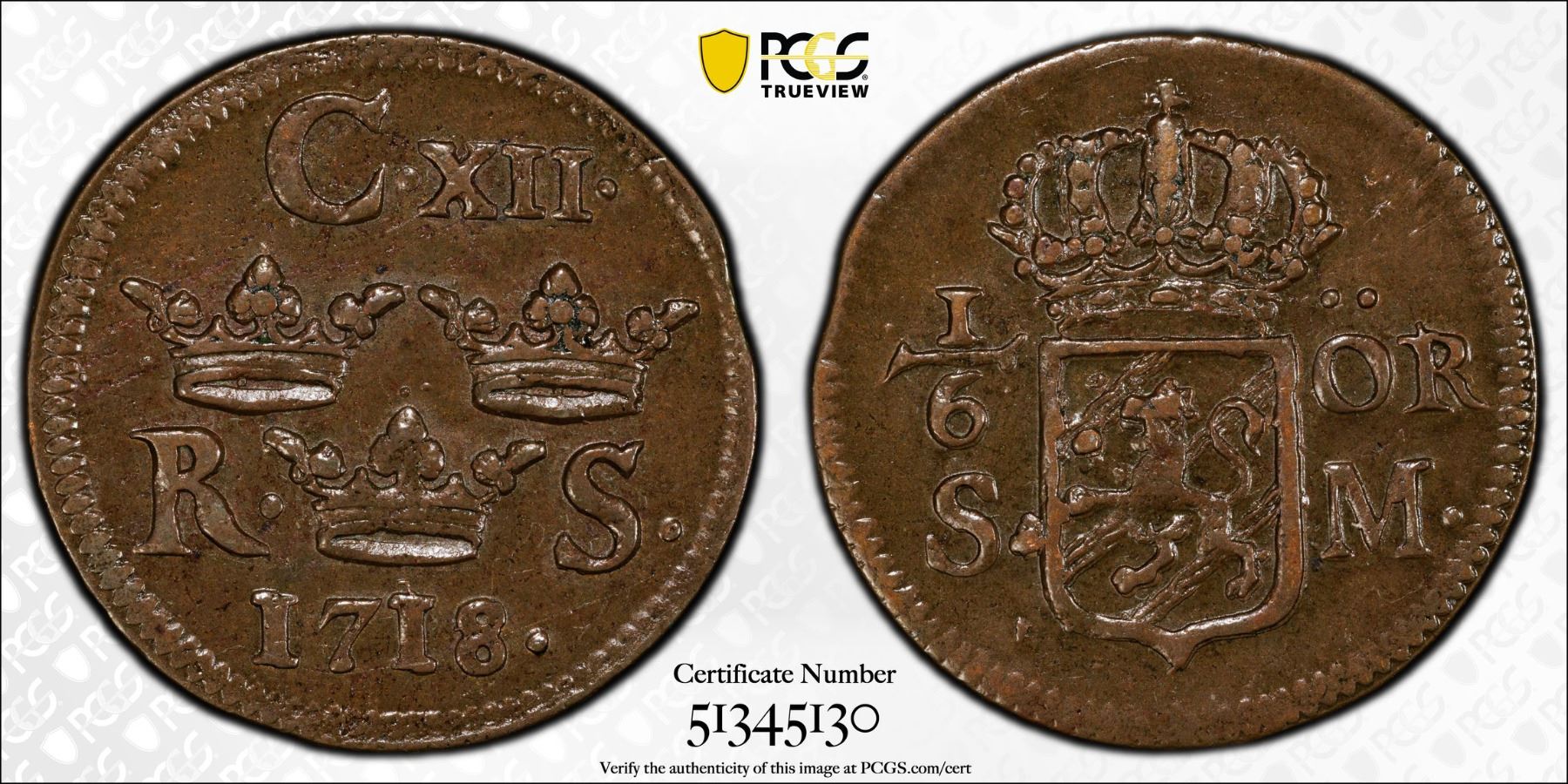 SWEDEN: Karl XII, 1697-1718, AE 1/6 ore, 1718, KM-334, a pleasing mint state example, PCGS graded MS62 BN.