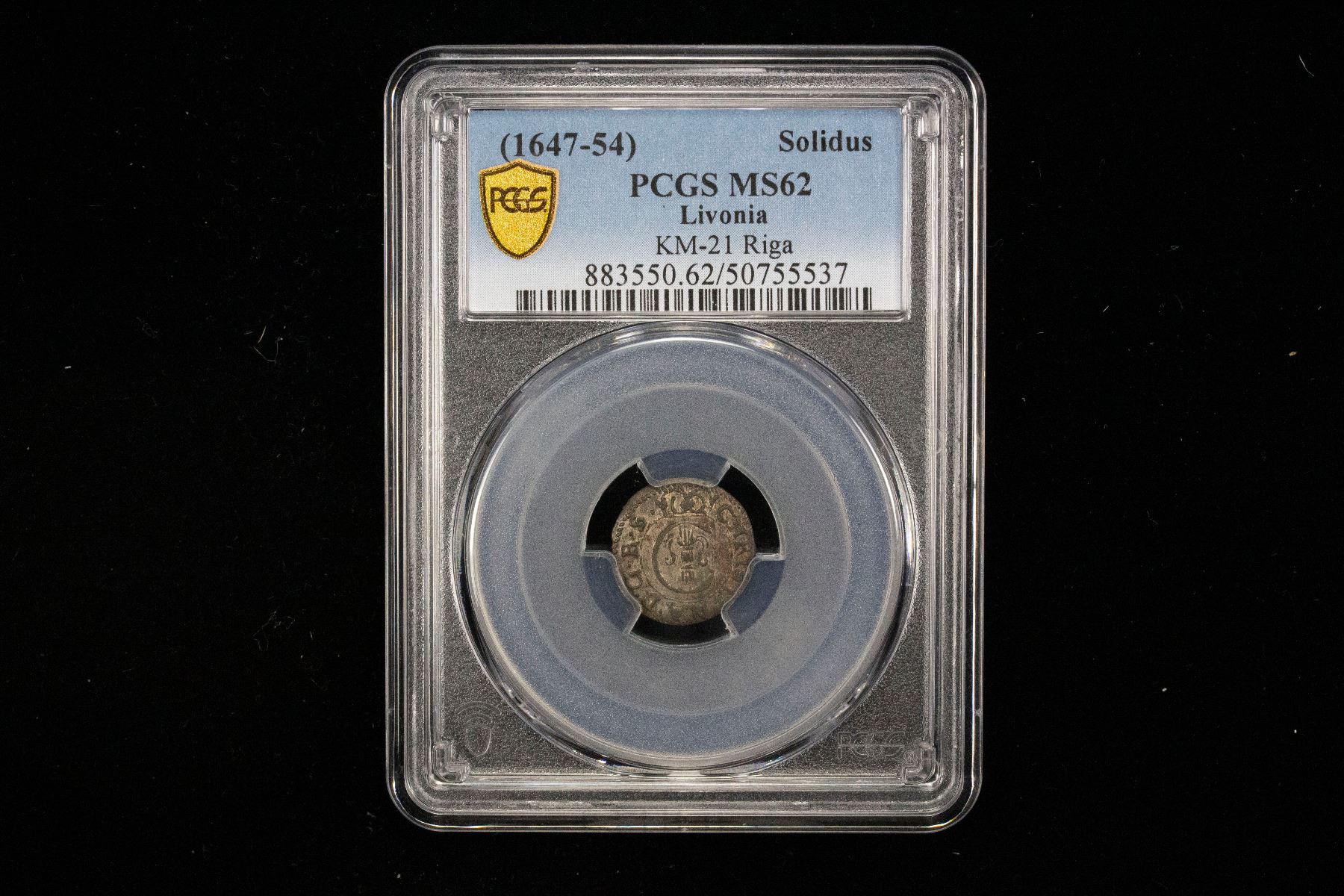 SWEDISH LIVONIA: Christina, 1632-1654, BI solidus, Riga (165)2, KM-21, Swedish occupation, type 2, minted 1645-1654, off center reverse with a visible "2" indicating the year of 1652,a pleasing lustrous mint state example, PCGS graded MS62.