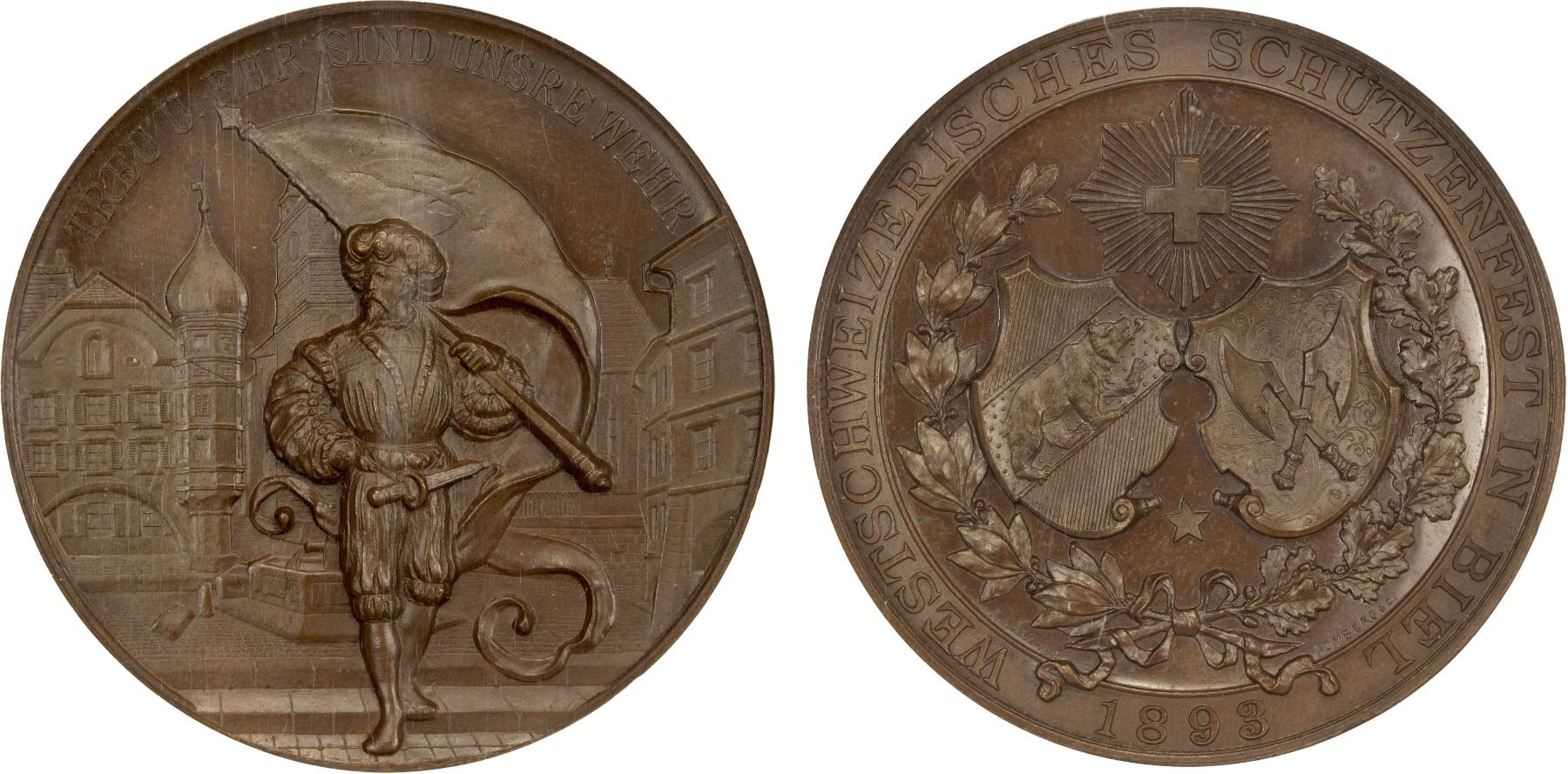 SWITZERLAND: AE medal, 1893, Richter-225b, Martin-139, 45mm bronze medal designed byR. Lanz, engraved by Homberg, issued for the 1893 western Switzerland shooting festival in Biel, male figure in period uniform advancing facing, carrying large flag of Biel over shoulder, buildings in background // cantonal and city shield side-by-side below radiant Swiss cross, star in between, wreaths around, a very appealing example struck in high relief with rich chocolate-brown patina and glossy luster, a superb lustrous example! NGC graded MS65 BN.