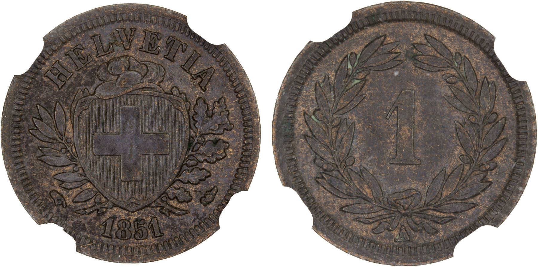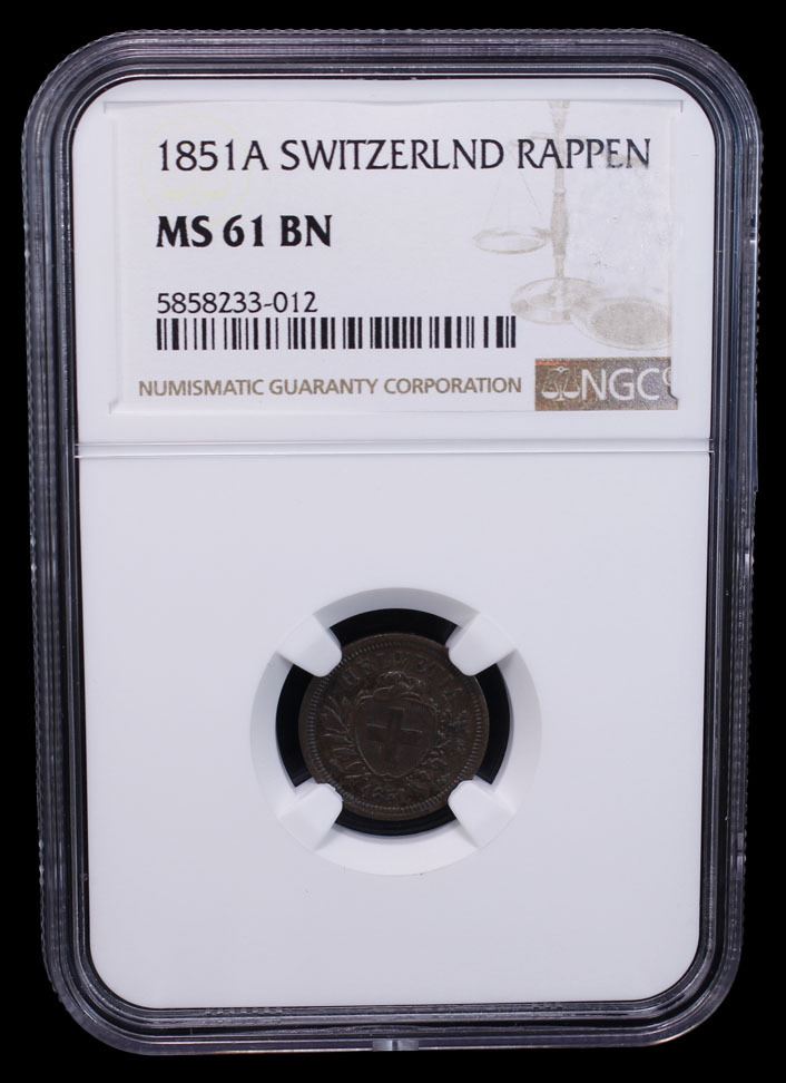 SWITZERLAND: AE rappen, 1851-A, KM-3, a pleasing example, NGC graded MS61.