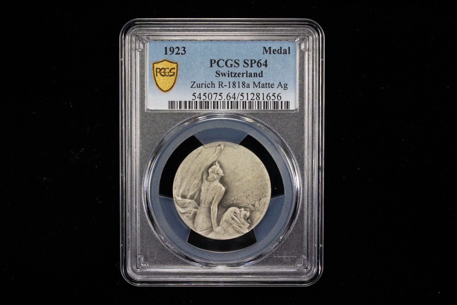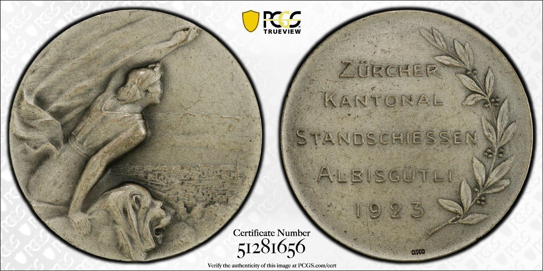 SWITZERLAND: AR medal, 1923, Richter-1818a, Martin-1095, 30mm silver medal by Huguenin Frères, Le Locle for the Zürich Cantonal Shooting Festival in Albisgütli; Helvetia facing away towards city and mountains, flag in left hand and right hand on lion // ZÜRCHER / KANTONAL / STANDSCHIESSEN / ALBISGÜTLI and date left of laurel sprig, a wonderful specimen quality example! PCGS graded Specimen 64.