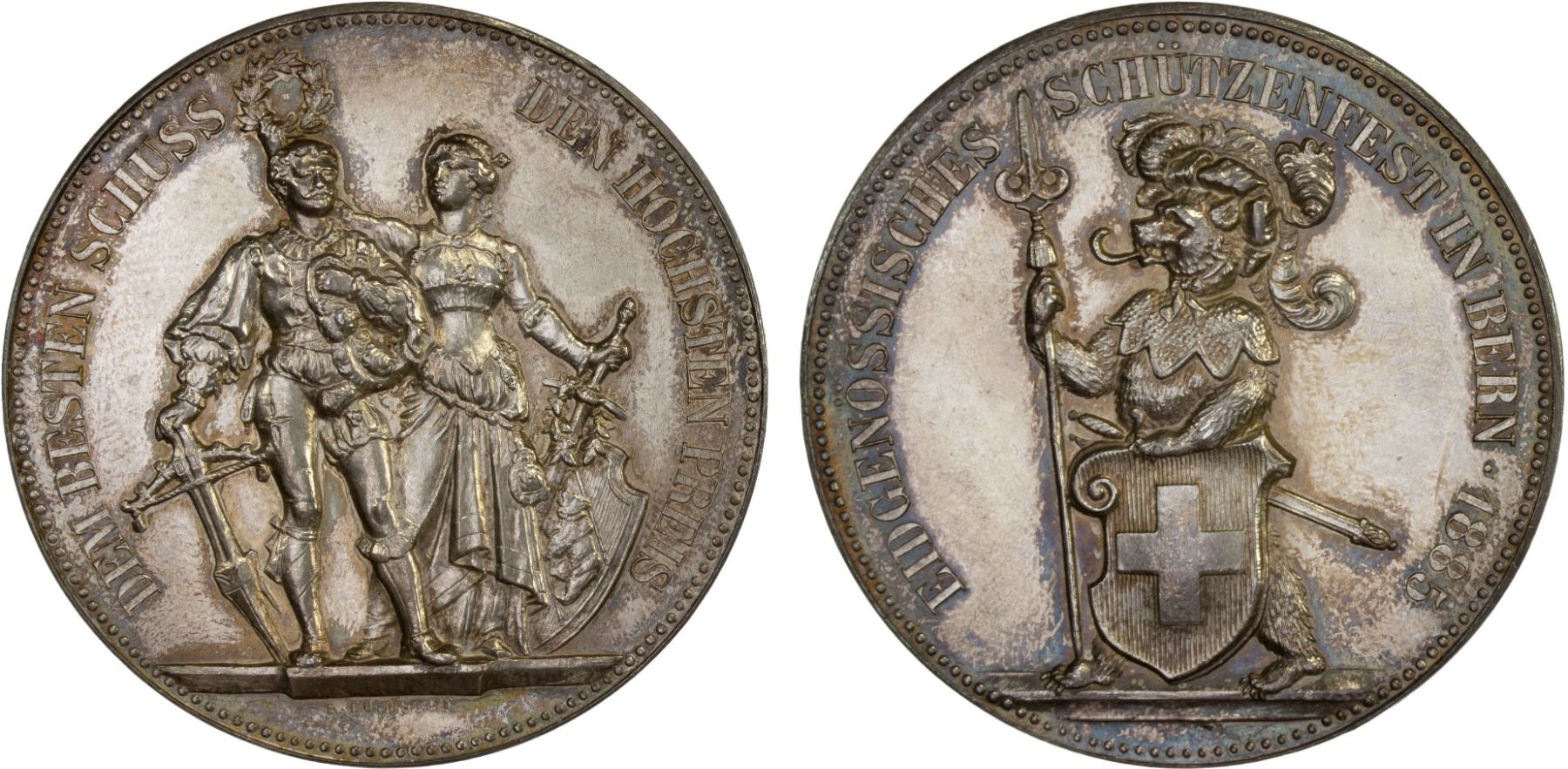 BERN: Canton, AR medal (27.35g), 1885, Richter-200b, Martin-119, 40mm high relief silver medal for the Federal Shooting Festival at Bern by Eduard Durussel, standing bear left wearing feathered hat and ruff, holding Swiss coat of arms and lance with "EIDGENOSSISCHES - SCHUTZENFEST IN BERN. 1885" around // young woman holding laurel wreath, sword, and a shield with the Bern coat of arms, crowning young man to her right who is holding a crossbow, with SEM BESTEN SCHUSS - DEN HOCHSTEN PREIS around, lightly cleaned, retoning, very rare in silver, plain edge, Unc.
