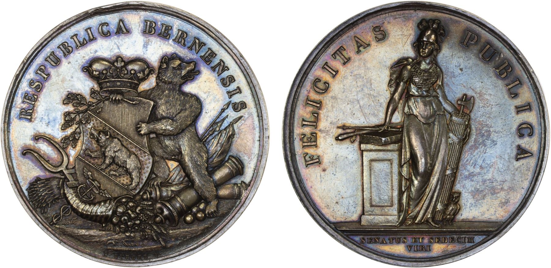 BERN: Republic, AR sechszehnerpfennig (90.47g), ND, Wunderly-1361, Roesle-54, SM-635, 58mm silver medallic issue by S. Burger; RESPUBLICA BERNENSIS, standing bear to left, head to right, holding twig in right and resting his left paw on crowned shield; cornucopia and cannons at feet // FELICITAS - PUBLICA above helmeted and cuirassed Minerva standing, resting her right hand on pedestal and holding fasces in left hand, owl at right; below SENATUS ET SEDECIM / VIRI. in exergue, struck after 1819, faint surface hairlines, a very attractive and beautifully toned example, AU.