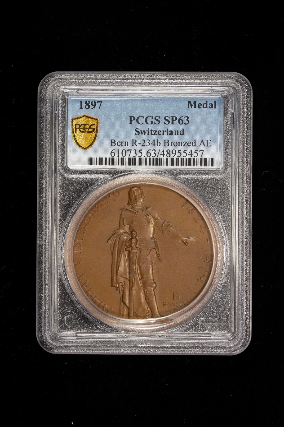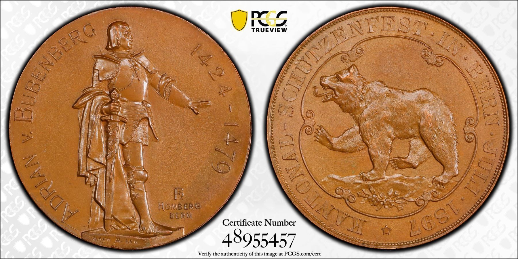 SWITZERLAND: Bern, AE medal, 1897, Richter-234b, Martin-149, 45mm, by F. Homberg, issued for the 1897 cantonal shooting festival, statue of Adrian von Bubenberg (by M. Leu in 1897), his name and dates around // bear of Bern left, supple brown patina, PCGS graded Specimen 63. Adrian von Bubenberg was a knight and the mayor of Bern in the 1460's-70's. He is remembered for leading the defense of Morat (Murten) during a 12-day siege by the Duchy of Burgundy and defeating them at the subsequent battle on June 22, 1476.