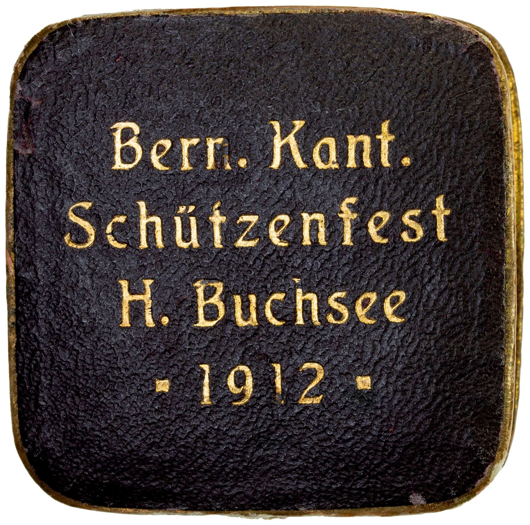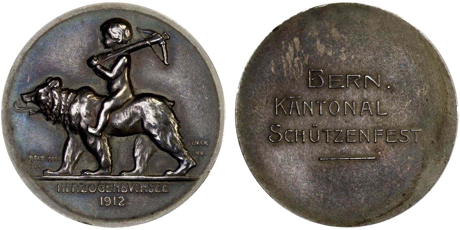 SWITZERLAND: Bern, AR medal (4.88g), 1912, Richter-273a, Martin-176, 24mm silver medalet for the Bern Cantonal Shooting Festival in Herzogenbuchsee by Linck for Holy Frères, St. Imier, BERN. / KANTONAL / SCHÜTZENFEST // young boy with crossbow over shoulder riding bear left with "HERGOZENBVCHSEE / 1912" in exergue, toned, plain edge, in original maroon plush box with gold lettering "Berr. Kant. / Schützenfest / H. Buchsee /. 1912 .", less than 250 pieces minted, rare, plain edge, Almost Unc.