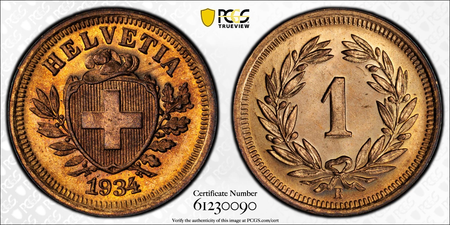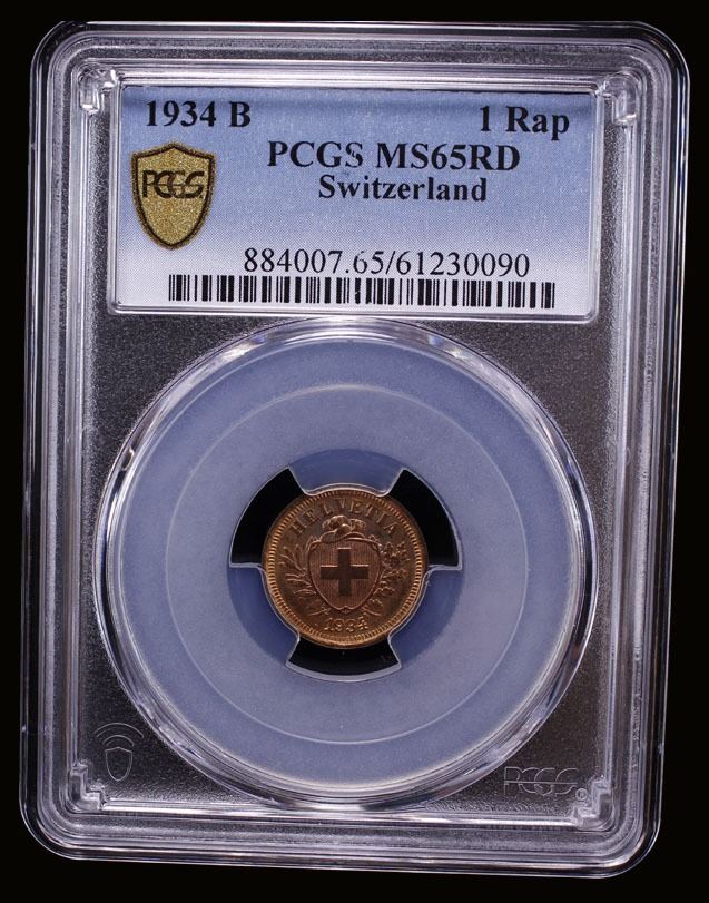SWITZERLAND: Confederation, AE rappen, 1934-B, PCGS MS65 RD