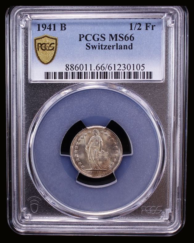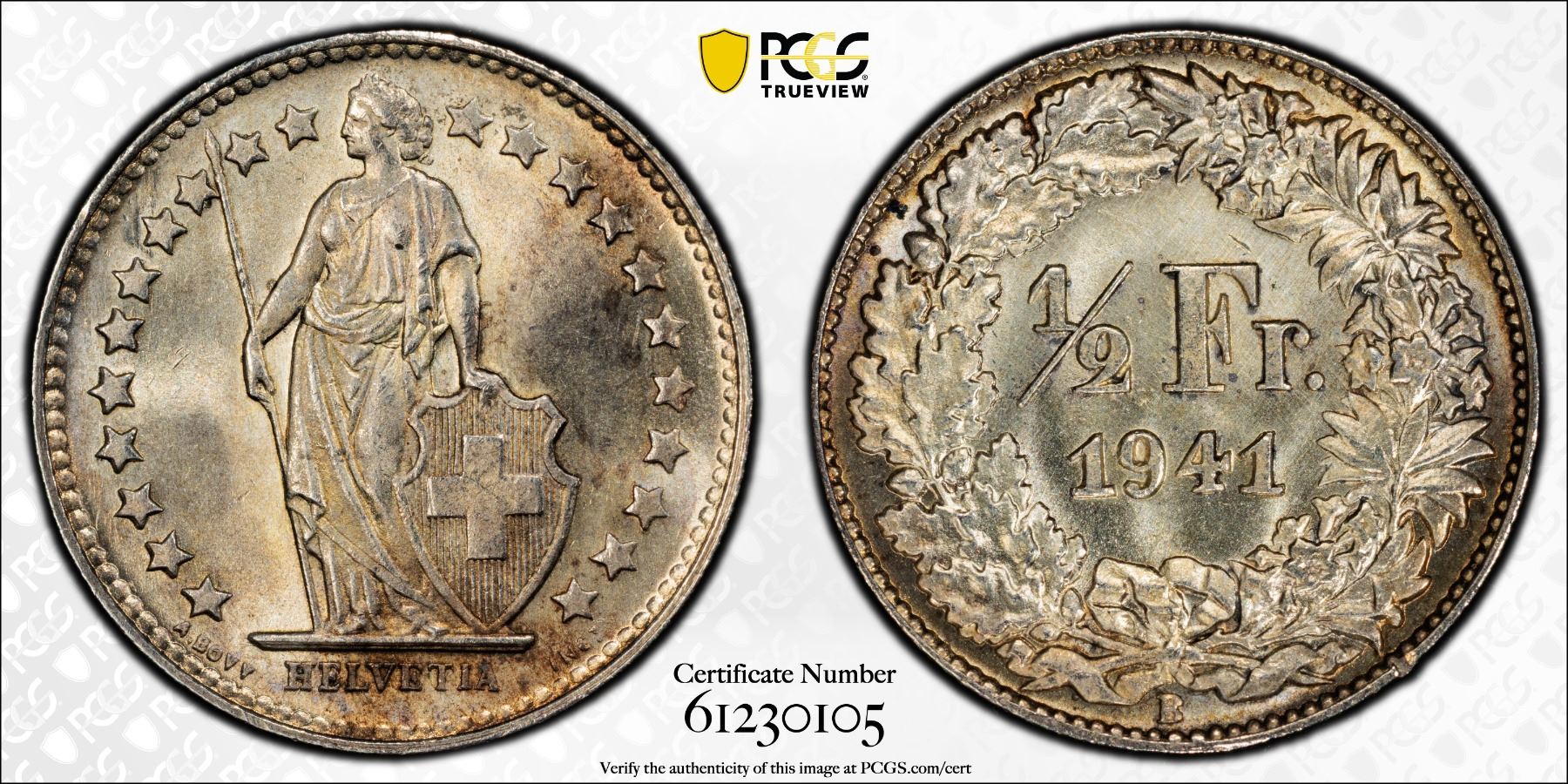 SWITZERLAND: Confederation, AR 1/2 franc, 1941-B, PCGS MS66