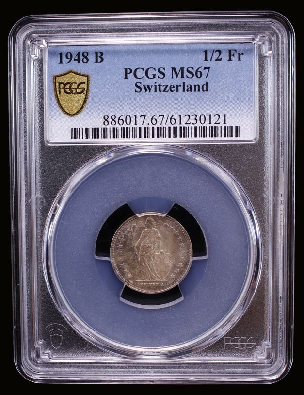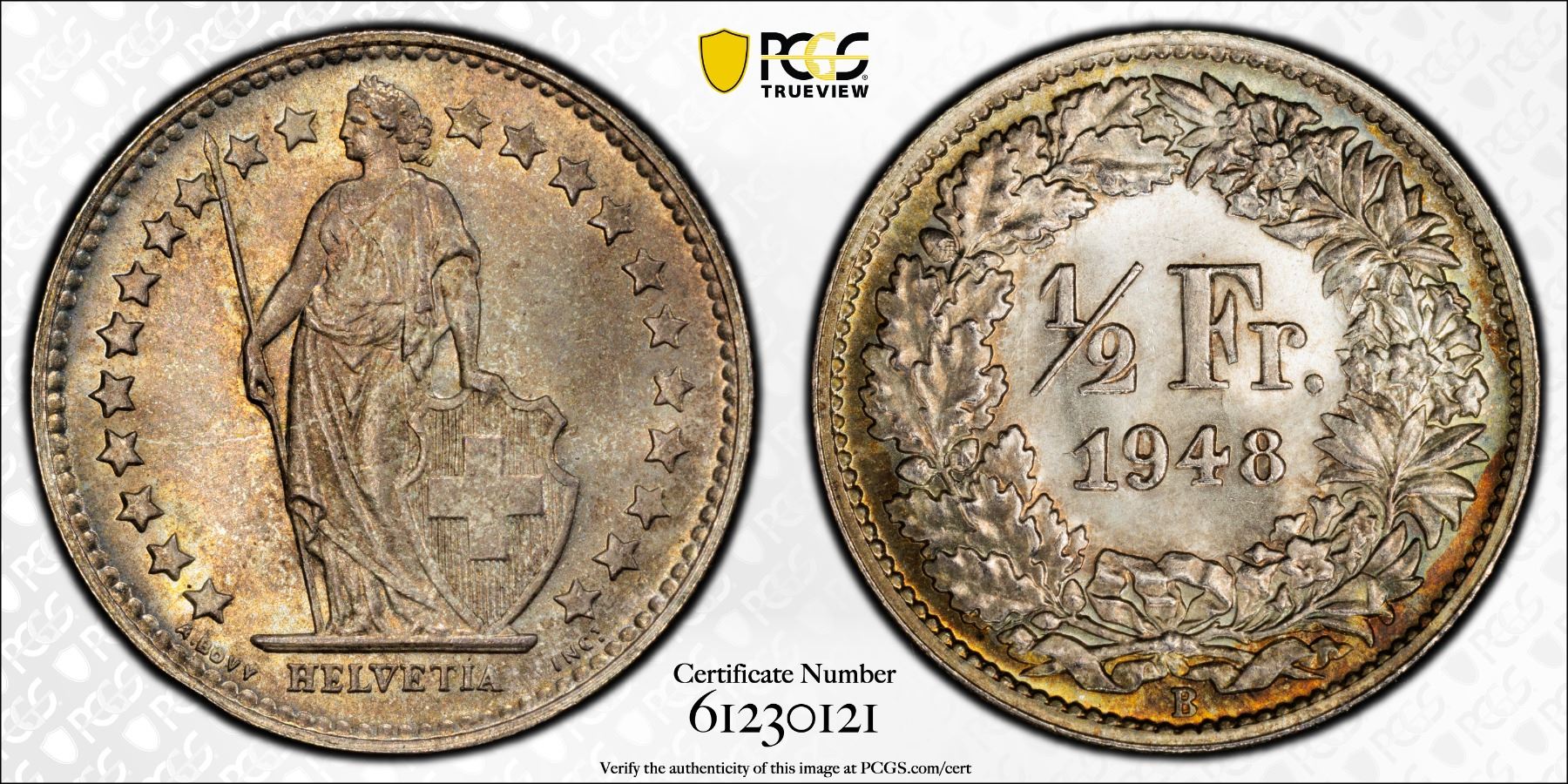 SWITZERLAND: Confederation, AR 1/2 franc, 1948-B, PCGS MS67
