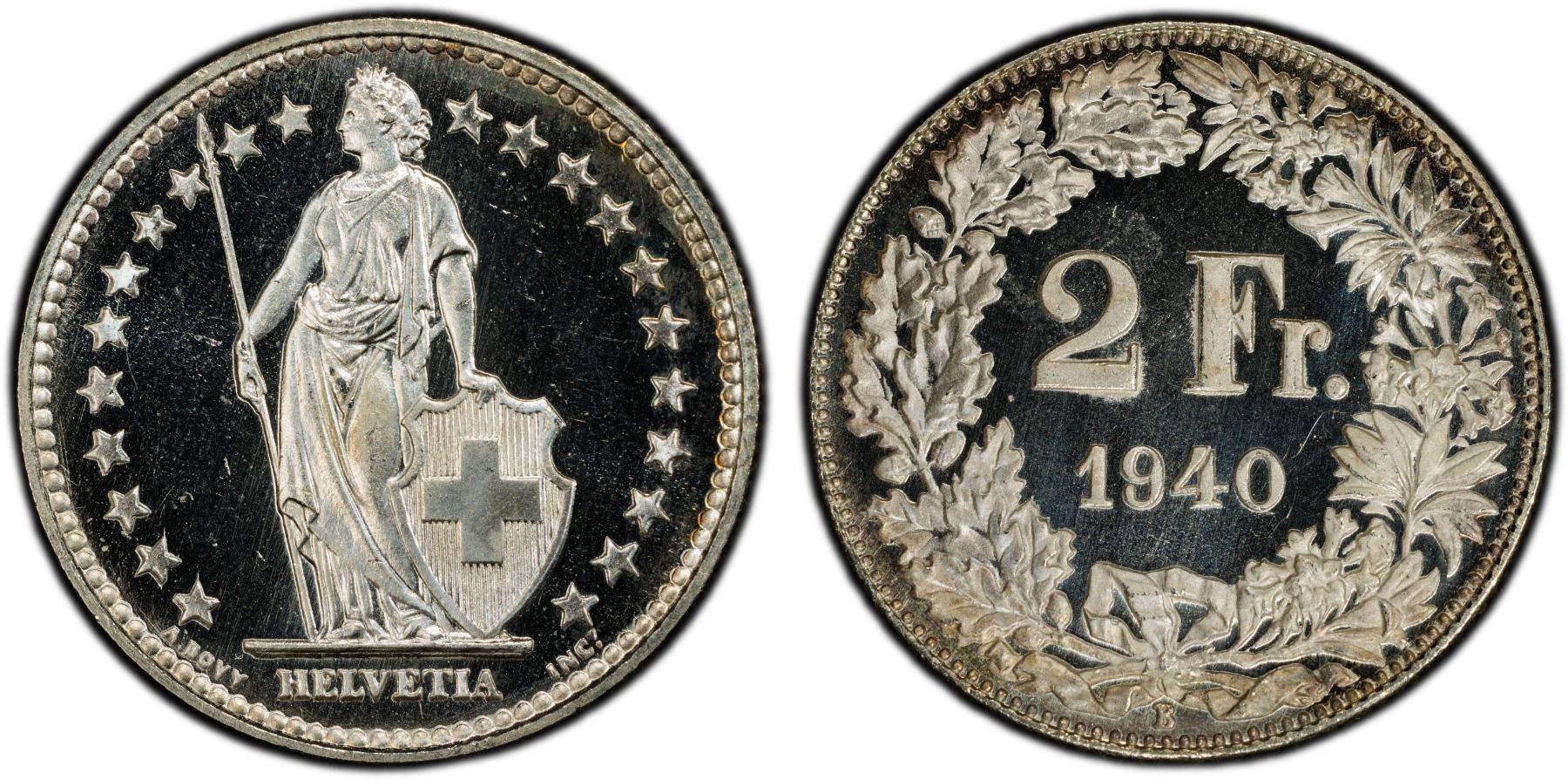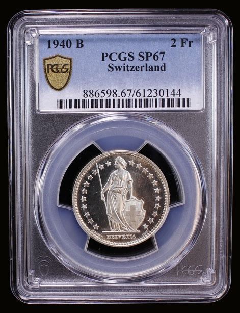 SWITZERLAND: Confederation, AR 2 francs, 1940-B, PCGS Specimen 67