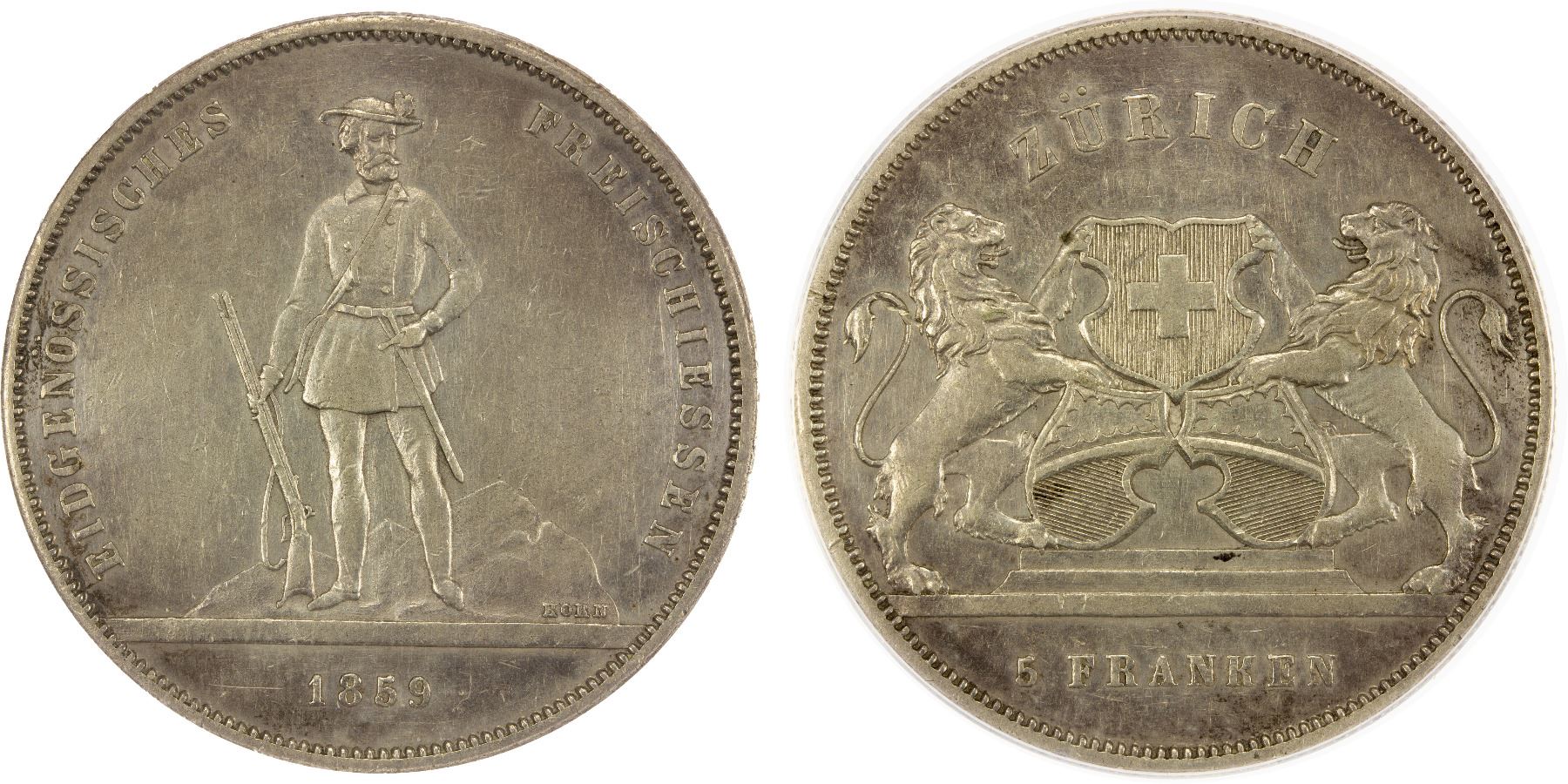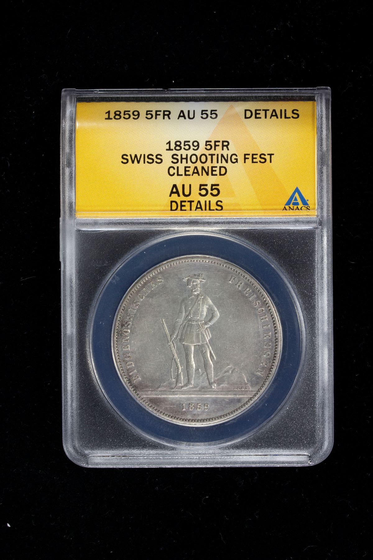 SWITZERLAND: Confederation, AR 5 francs, 1859, KM-XS5, Zurich Shooting Festival, lightly cleaned, ANACS graded AU55 details.