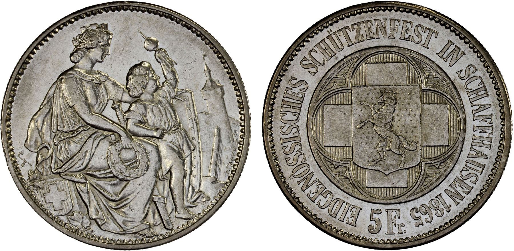 SWITZERLAND: Confederation, AR 5 francs, 1865, KM-XS8, Federal Shooting Festival at Schaffhausen, lightly cleaned, but attractive, XF.