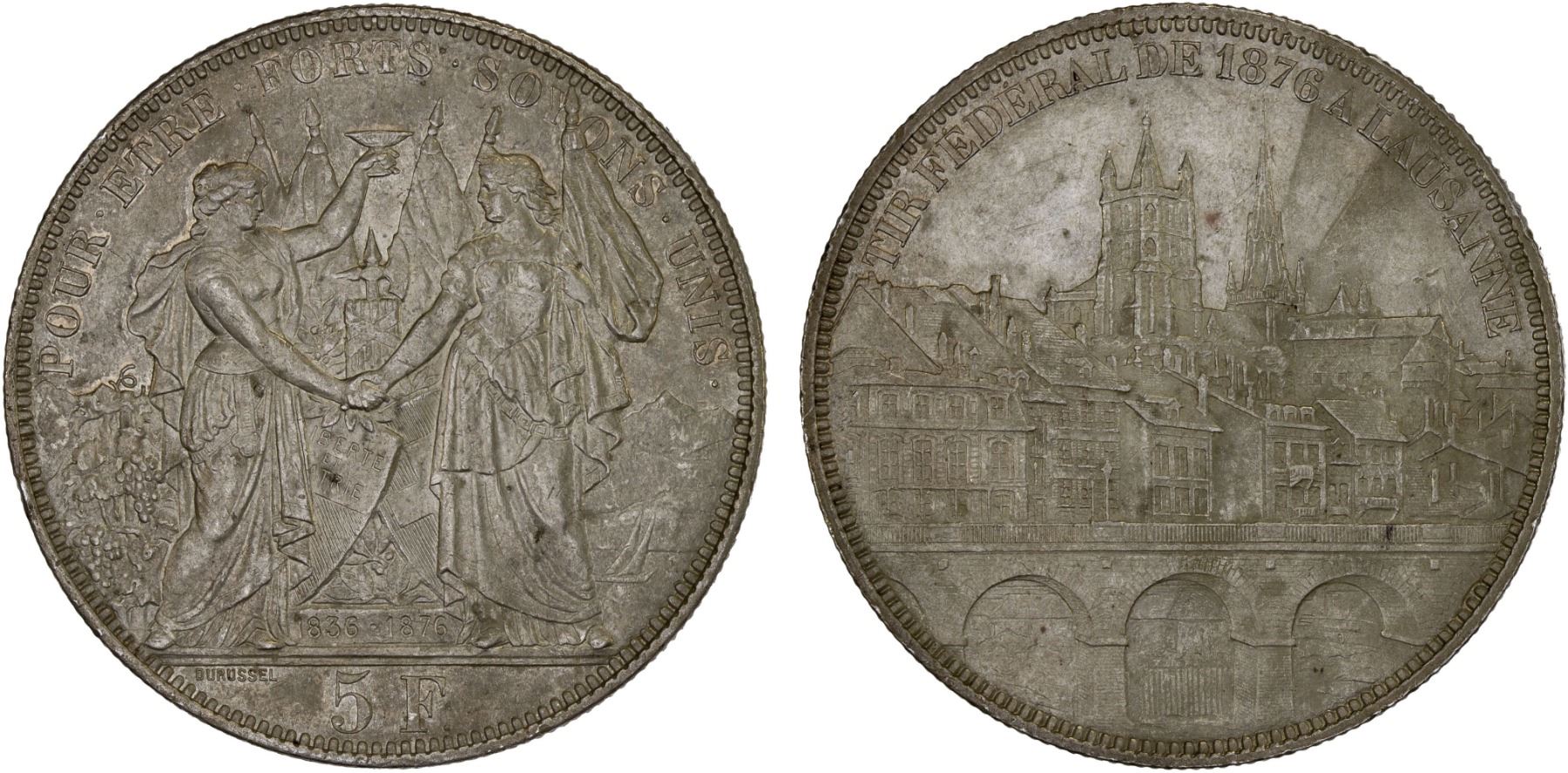 SWITZERLAND: Confederation, AR 5 francs, 1876, KM-XS13, Lausanne Shooting Festival, some light hairlines that have re-toned, AU.