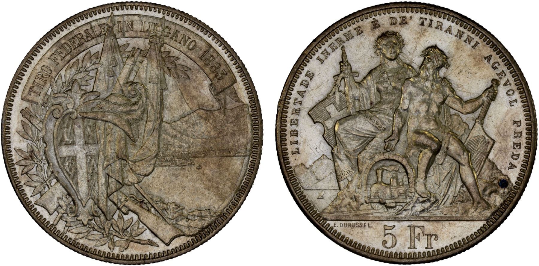 SWITZERLAND: Confederation, AR 5 francs, 1883, KM-XS16, Lugano Shooting Festival, lightly cleaned and partially re-toned, AU.